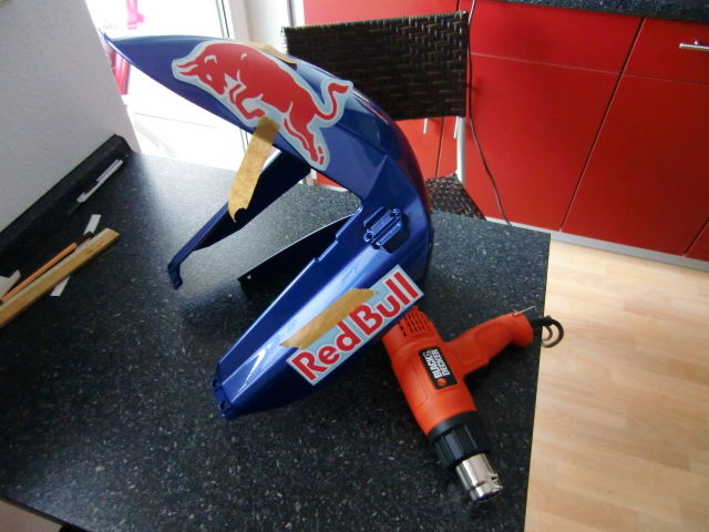 Nach dem Füller schleifen kann der Lack drauf !Das Lackieren geht dann am schnellsten.Ich hab mir das Red Bull Blau ausgesucht aber nicht als Wasserlack den kann man nur in einer Lackierkabine verwenden.