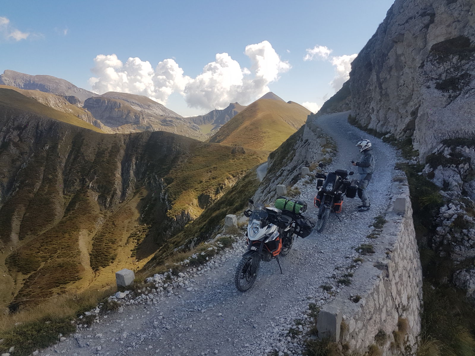 Ich habe die Offroad Felgen der 1190 R bestellt, die schmaler sind und fuhren mit Mitas E10 vorne und E09 (beides Dakar Versionen) und 4mm Heavy Duty Schläuchen. Absolut problemlos und mit einem kleinen Kompressor konnten wir den Druck nach den Schotterpassagen wieder auf den normalen Strassendruck heben. Im Schotter jeweils um 1.6vo ; 1.8 hi, inkl. Satteltaschen und dem restlichen Plunder.