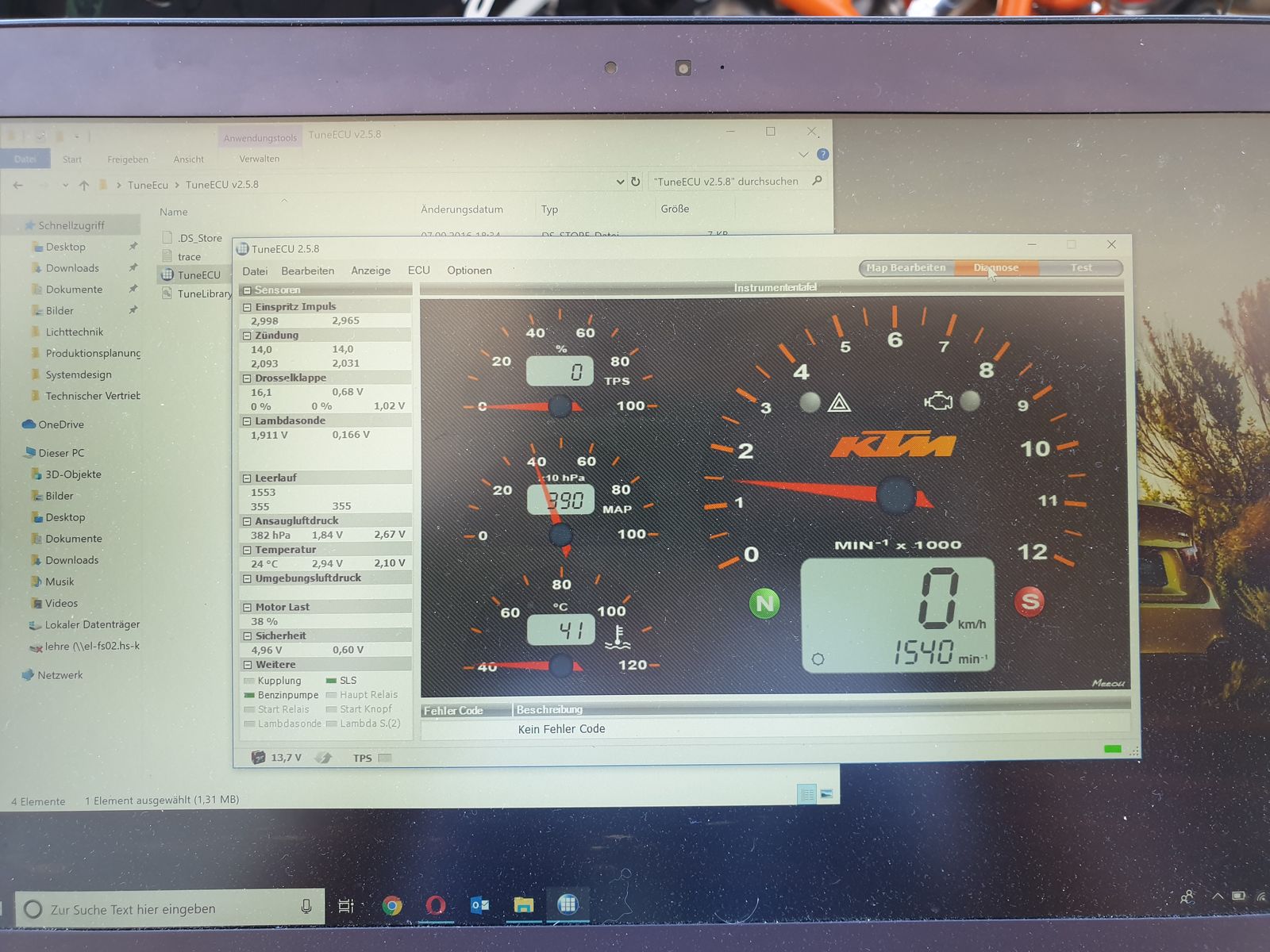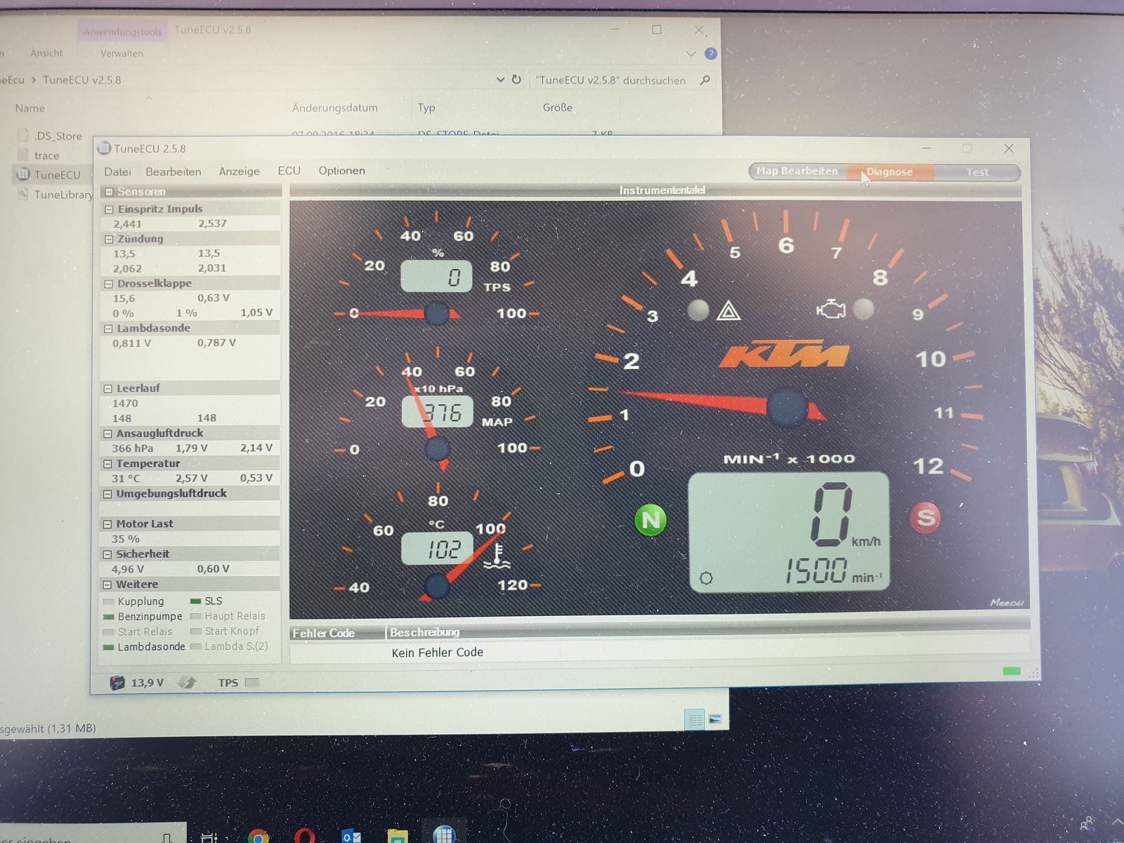 Ich bin noch ein ziemlicher Laie, was TuneECU betrifft. Deswegen habe ich Bilder der Werte gemacht, wenn das Motorrad Bild 3) kalt ohne Probleme im Leerlauf läuft, Bild 2) warm ohne Probleme im Leerlauf läuft und Bild 1) warm mit Problem bei einem Standgas von knapp 3000 U/min läuft.
