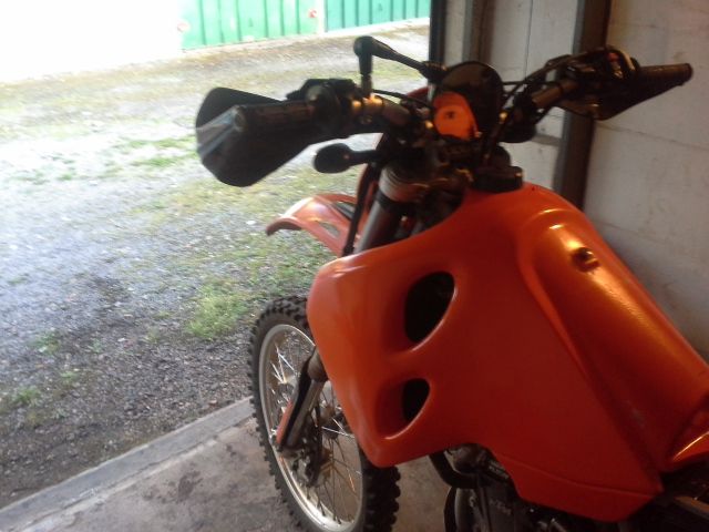 Den späteren, schwarzen 18-Liter-Tank hatte ich an meiner eigenen 625SXC montiert, anbei das einzig verfügbare Foto. Paßt plug and play, zumindest wenn neu. Achte darauf, daß Du den passenden Schlüssel mitgeliefert bekommst, sonst brauchst Du noch einen neuen Tankdeckel. Letztere gibt es übrigens mit und ohne angesetztem Stutzen für einen Tankbelüftungsschlauch. Zu diesem Tank paßt nun weder die Sitzbank einer 620EGS noch diejenige einer 640Adventure. Das Vorderteil der Sitzbank muß in den speziell ausgeformten Ausschnitt an diesem Tank passen. Die Sitzbank einer 640 Enduro (mit dem 12-Ltr.-Tank serienmäßig) paßt halbwegs, deren Vorderteil ist aber nicht steil genug, sodaß man hier immer Spannung auf der Sitzbankschale hat und auch Falten im Bezug. Aber: es gab ein einziges Baujahr der 640er, wo es diesen 18-Ltr-Tank zusammen mit der passenden Sitzbank seitens KTM gab. Ich meine mich zu erinnern, daß es das Modelljahr 2000 war. Silbergraue Maschine mit einer grau-schwarzen Sitzbank. Achtung, den 12-Liter-Tank gab es wohl parallel. Wenn Du auf mobile eingibst "KTM 640 Enduro EZ 2000" siehst Du im derzeit ersten Angebot die Kombi, die ich meine. Und auf Ebay-Kleinanzeigen gibt es derzeit einen 18-Ltr-Tank. Möchte hier die Links nicht reinstellen... Klar: den Schnellverschluß mußt Du auch in diese Sitzbank setzen. Und wenn es Dir wichtig wäre: man kann den Tankdeckel umbauen auf Gleichschließung zu Deinem Zündschloß. Ist fummelig, macht aber normalerweise der KTM-Händler auf Anfrage. Und für den Anschluß des Tanks an den Vergaser verwendest Du am Besten den speziellen, zweimal um ca.90° gebogenen Formschlauch, den es von KTM für diese Art Tank gibt.