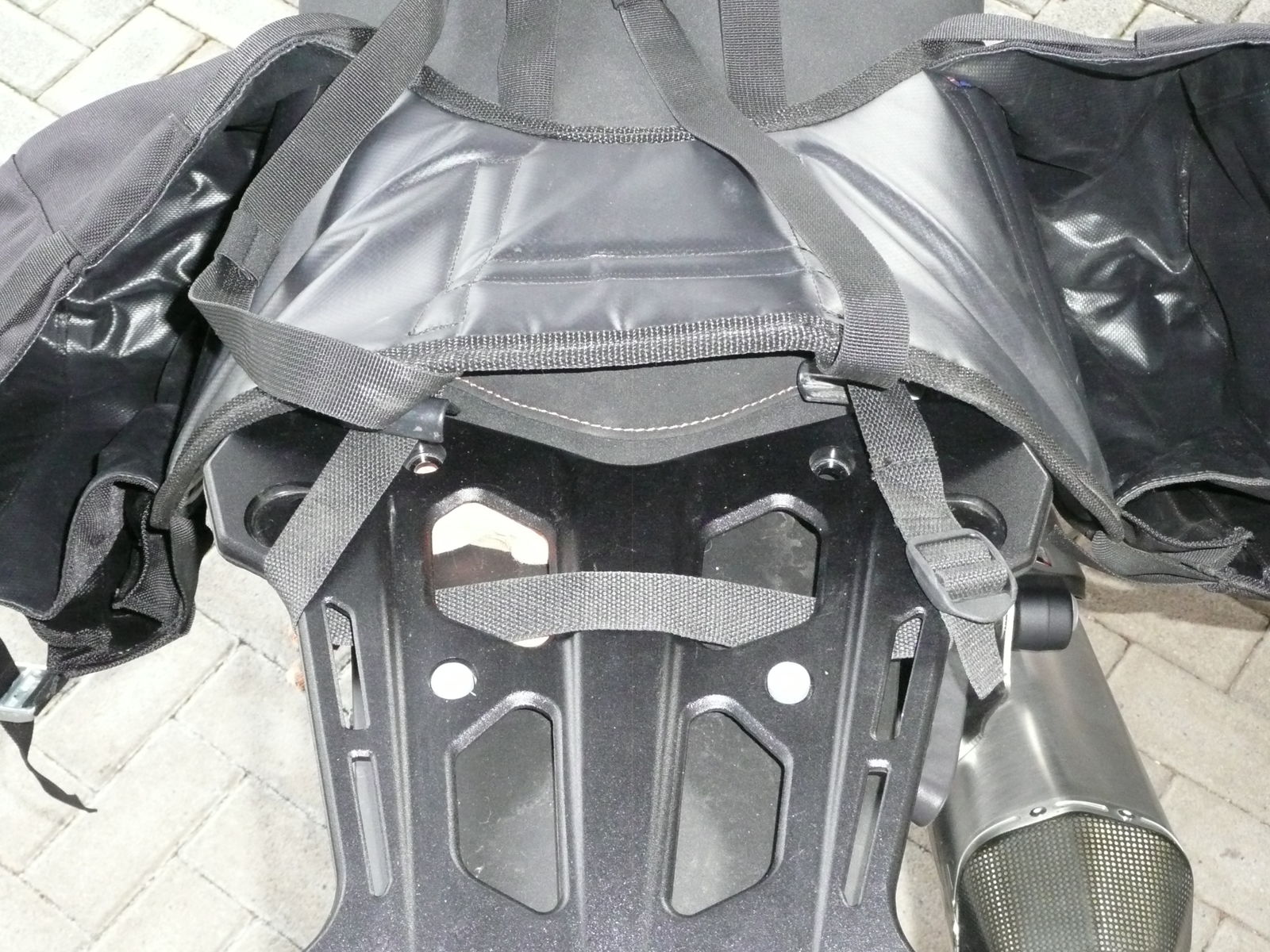 Variante 1 = halb auf dem Soziussitz. Siehe Fotos 1 bis 3. Der hintere Gurt ist direkt durch die Gepäckplatte gefädelt. Die beiden seitlichen Abspanngurte gehen zu den Soziusrasten. So montiert liegt der Packsack am Besten, weil er sich zumindest teilweise an den hinteren Seitendeckeln abstützt. Der Packsack liegt rechts gut oberhalb der Strebe, welche den Auspuff hält.