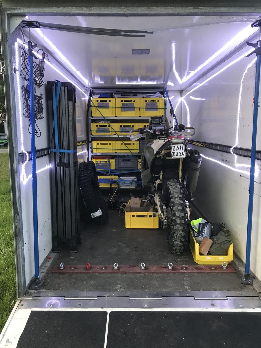 Schnell noch eine neue Anhängerkupplung gebaut um den Servicehänger mitzuführen, schließlich will man ja nicht bei jedem Camp Wechsel alles vollständig verstauen. Noch „schnell“ Licht rein, Regale und Befestigungsschiene und ab zum Eintragen der „Ackerschiene“.