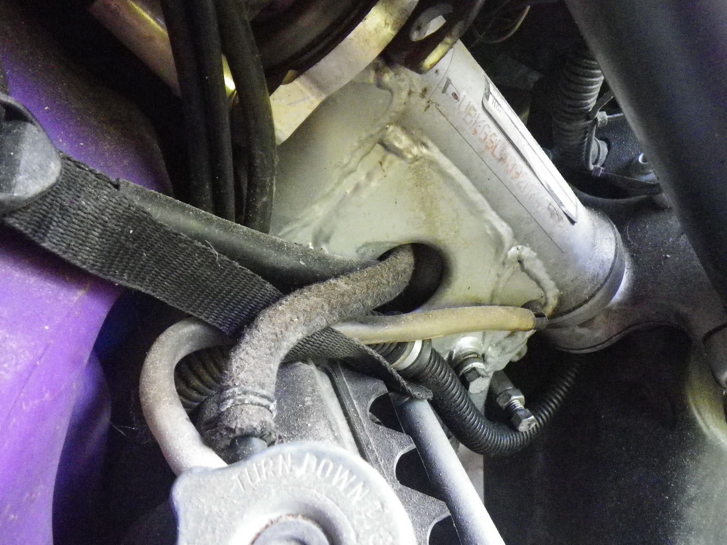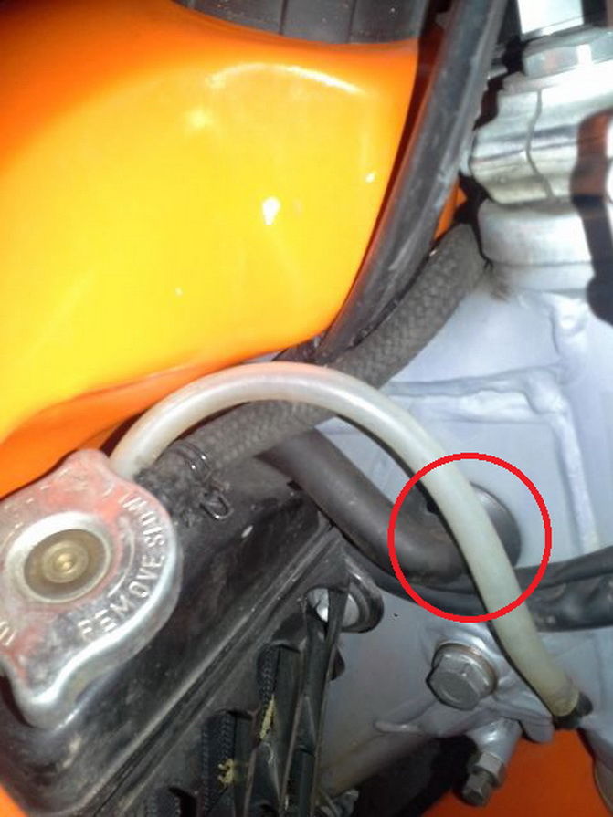 Der dünne Kühler-Verbindungsschlauch gehört durch das runde Loch im Rahmen gefädelt!