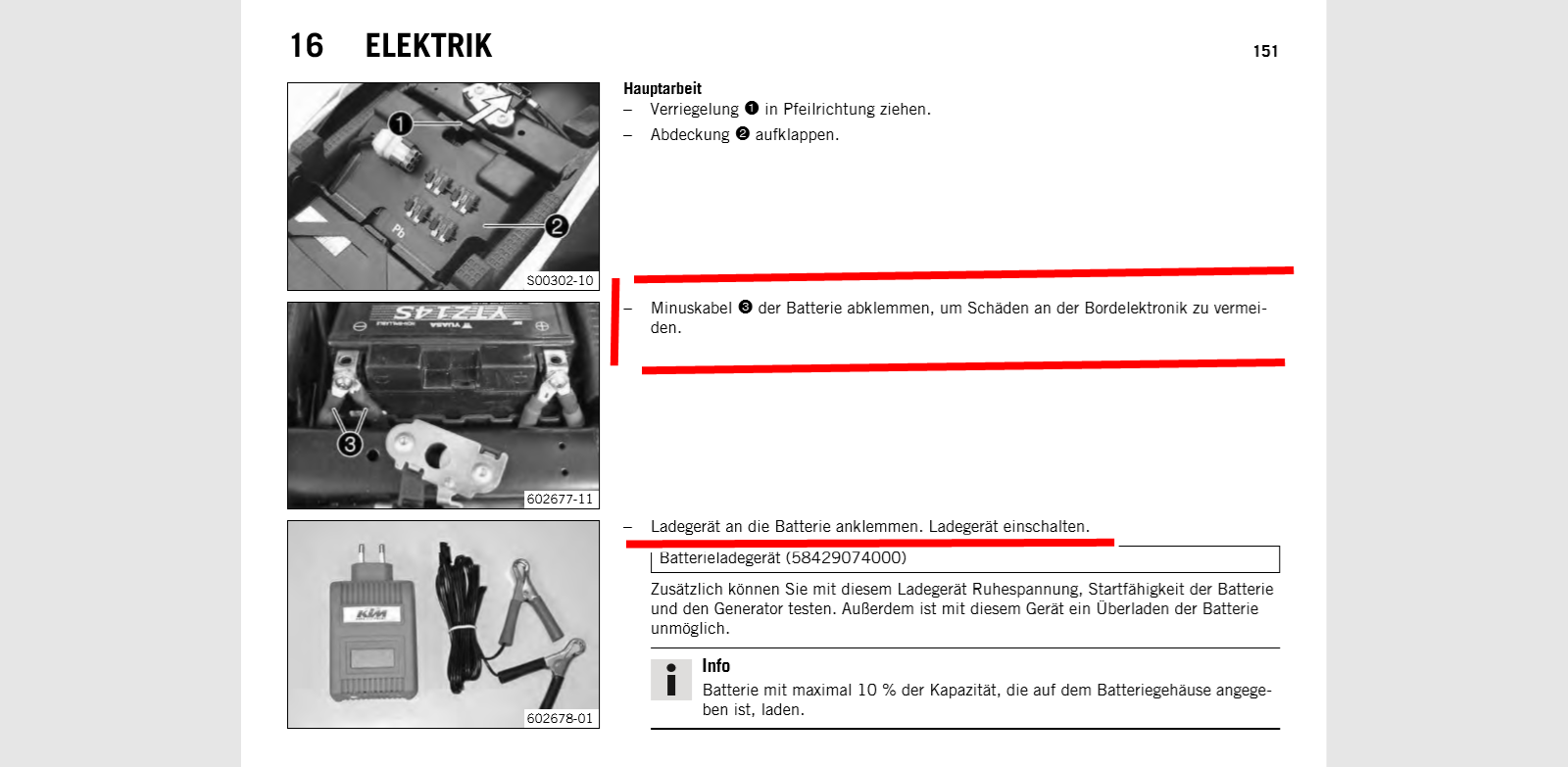 "Wenn die Batterie nicht mit dem KTM-Batterieladegerät geladen wird, ist die Batterie zur Ladung auszubauen. Durch Überspannung können sonst elektronische Bauteile beschädigt werden."