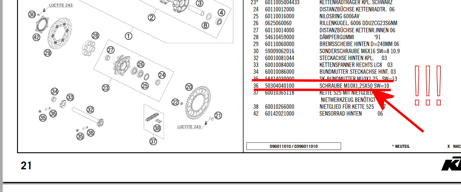 Auf der 990iger Zubehör-Liste steht nichts von 2,5 cm Länge......das ist deffinitiv zu kurz...schaut Euch nur auf meinem Foto, ganz am Anfang des Threads, die Gewindelänge in der Schwinge an....wie soll da 2,5 cm Gewindelänge greifen (wenn auch noch die Kontermutter drauf sitzen soll Laughing ), wenn man bis zum Ende der Kettenspannung justieren will? Außerdem steht auf der Liste M10 x 1,25 x 50 (mit meiner gut funktionierenden Lesebrille identifiziert), das sind 50mm!!!!!!! Wie kommt Ihr auf 25mm...das würde mich doch interessieren?????