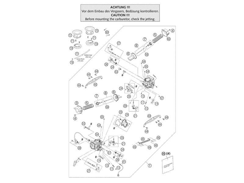 dem Foto nach handelt es sich bei dem eingepreßten, schwarzen Kunststoffstutzen um den Anschluß für die Vergaserentlüftung, meine ich. Da kommen die Schläuche Pos.77 drauf, die nach unten durch die Airbox durch ins V zwischen den Zylindern führen. Früher waren da Klarsichtschläuche drauf, später in der Serie ersetzt durch Gummischläuche. Die Pos.53 dagegen sind die Messingstutzen für die Benzinzufuhr, mit je 3 O-Ringen, von denen bisher im Thread die Rede war... Deine Plastikstutzen gibt es bei KTM nicht als Ersatzteil. Einfach den abgebrochenen Stutzen offen lassen geht nicht, da die Vergaserbelüftung aus der Airbox rausgeführt werden muß (atmosphärischer Luftdruck). Da sollte schon wieder der Schlauch (in der vorgegebenen Länge) drauf. Auch der Öffnungsdurchmesser sollte möglichst nicht kleiner werden. Vielleicht findet sich ein brauchbares Winkelstück, das man adaptieren kann. Ich habe jedenfalls unter der Vergaserbezeichnung KEIHIN CVRD43 im Netz keinen Lieferanten für den defekten Stutzen finden können. Dumm gelaufen, aber mit etwas Bastelei wieder funktionsfähig zu bekommen!