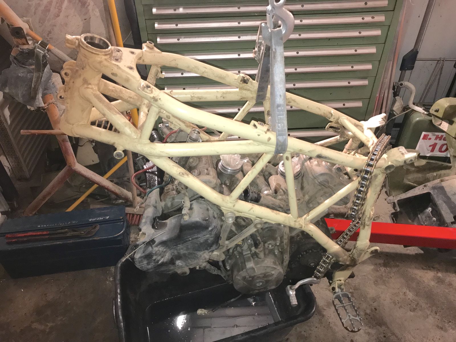 Nachdem der Vorbau an 5 Stellen gebrochen war, die Schwinge durch verbogenen Hauptständer fast durchgeschliffen und der Kabelbaum eher einem Kupferkern glich, war das auch bitter nötig.