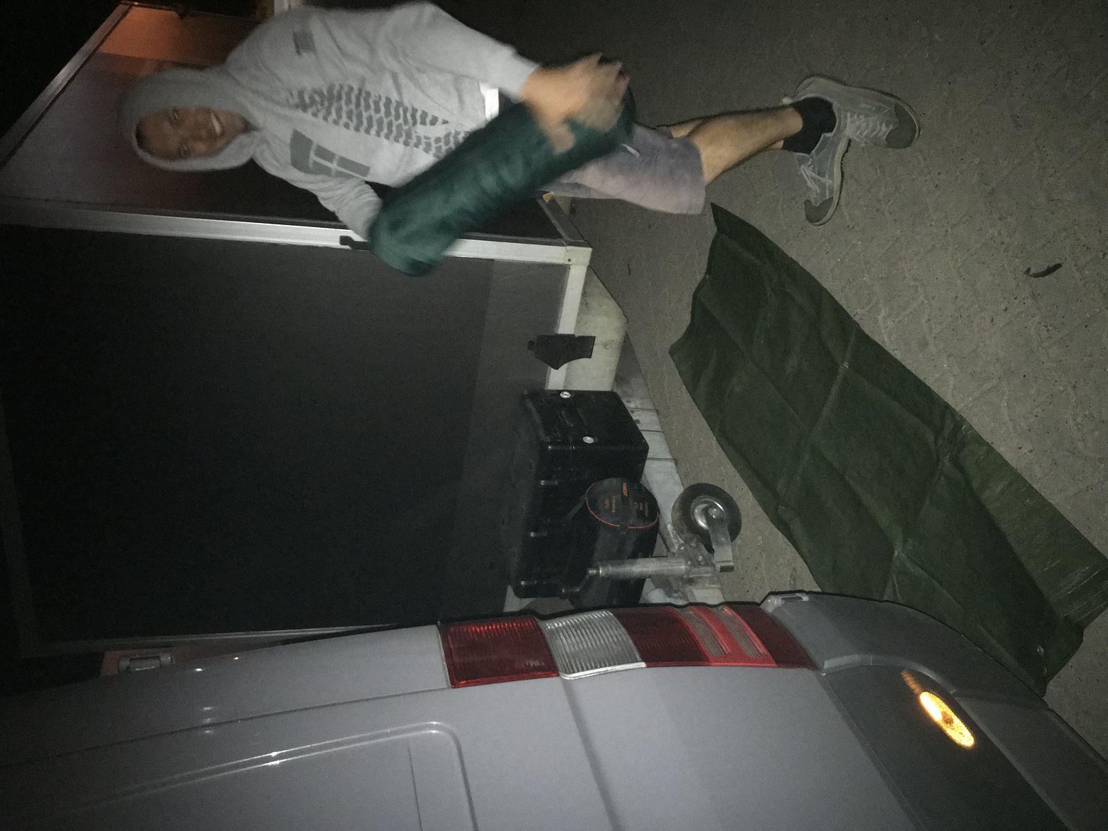 Andy quer über die Sitze, ich quer im Fußraum und Robbe mittels Isomatte zwischen Anhänger und Sprinter….was für eine glorreiche Nacht.