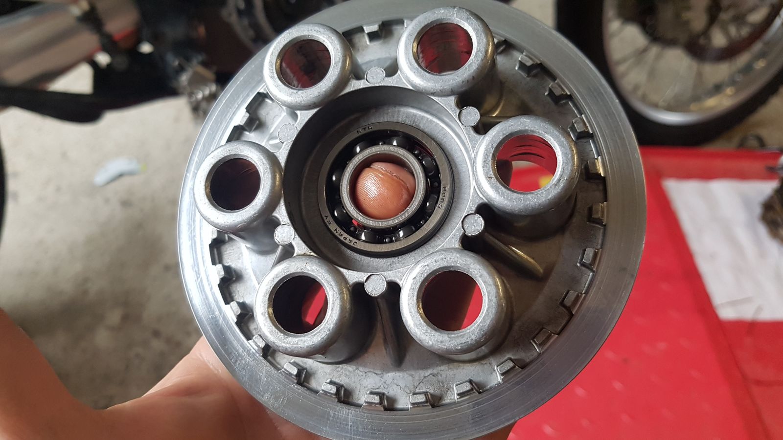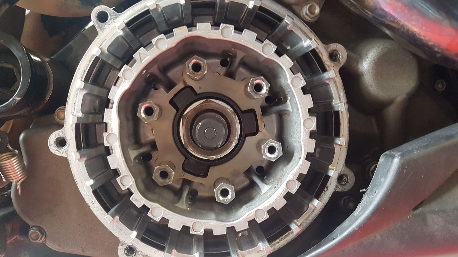 Seit der tour zum IZI Meeting ist es nun so schlimm geworden, dass das unhaltbar war. Also mal noch mal alles raus inclusive stützscheibe und federteller. Nichts, kein Befund. Dann laut Forum Tipp mal Stahl und Reiblamellen mal andersherum eingebaut. Und dann habe ich zum ersten Mal bemerkt, dass die vormals letzte Stahllamelle, die also ganz hinten vor der tellerfeder sitzt, eine kreisrunde Riefe hatte.