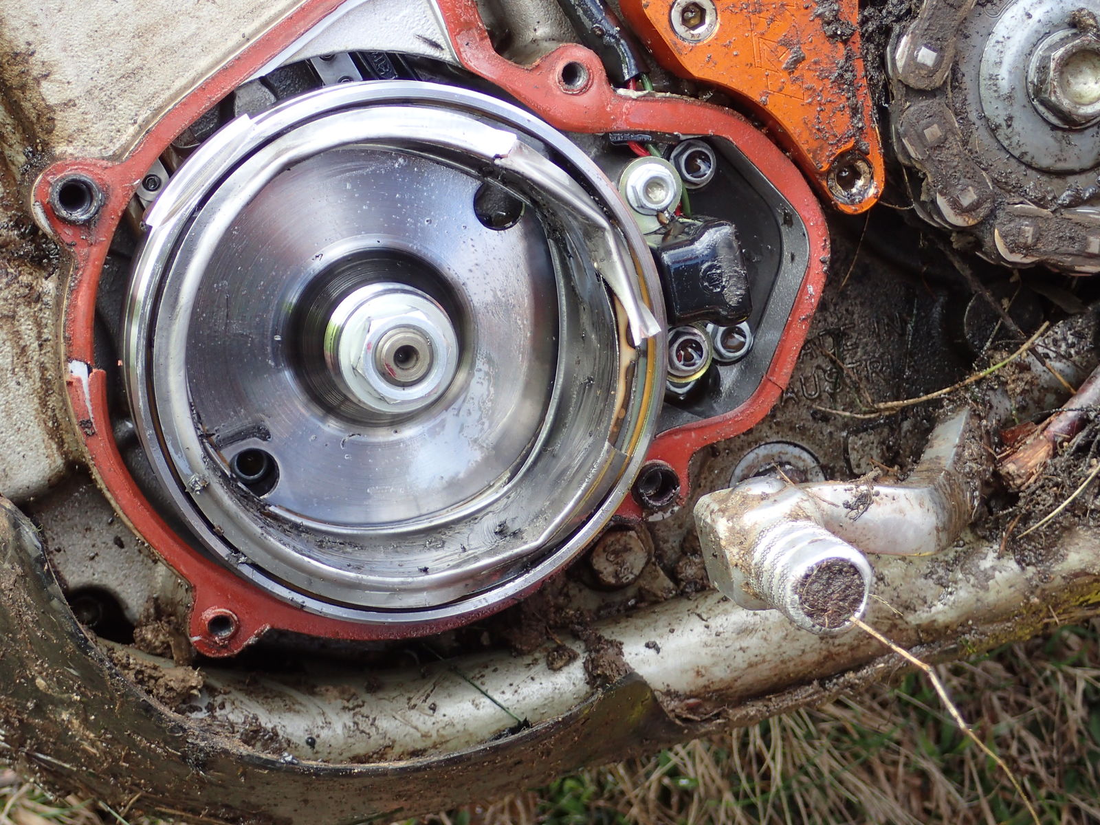 Eine winzige Felsplatte hat 14 Jahre gewartet bis es meine 2005er MXC fast verschrottet hat . Es war ein harmloser Sturz, also eher ein Umfaller in einem harmlosen Gebiet. Habe die Maschine aufgerichtet, gestartet und bin weitergefahren. Nach ca. 200m bin ich stehengeblieben da ich von links unten komische Geräusche gehört habe. Das Malheur war sofort klar: der LiMa-Deckel hatte mehrere Risse, der Rotor war kaputt und die Spule hatte auch was abgekommen. Mein linker Stiefel war natürlich voll eingeölt . Zum Glück habe ich nach 4h eine Ersatzmaschine bekommen, sonst hätte meine die Tour dort enden müssen nicken .