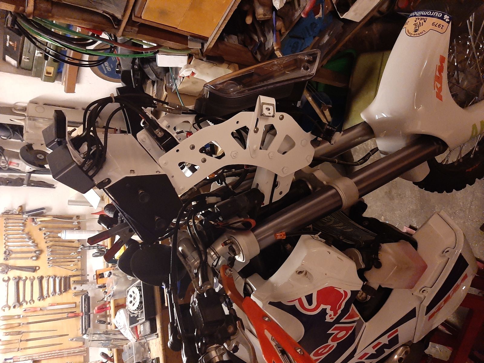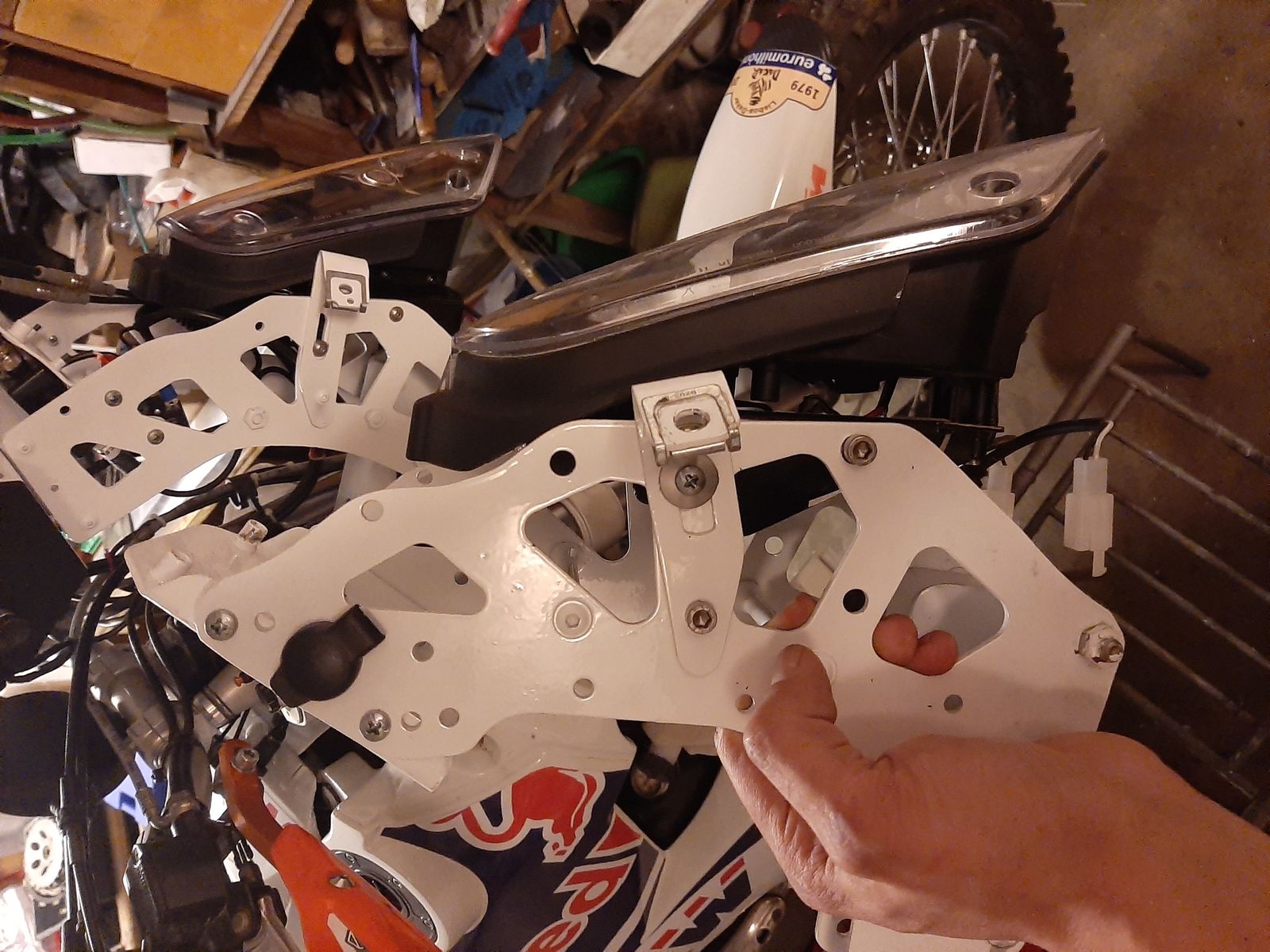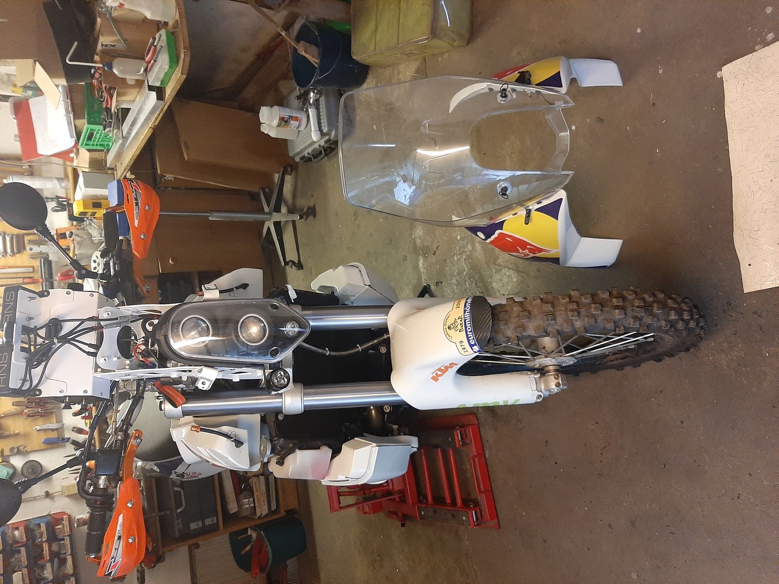Der Koti ist von ner alten LC4 Rally.. Kannst Du noch bei KTM für viel Geld bestellen.. Abbaaa die Qualität ist nicht besser als von unseren Freunden aus Polen.. vermutlich produzieren die den Mist für KTM.. Ich hab ein Paar alte Gabelschützer abgeschnitten und den Koti damit noch um 2cm angehoben.. dann musst Du abber den hintern Teil (zum Kühler) auch gleich mal um 5..6cm kürzen. Okay, ich hab es halt provoziert und in Marisfeld dann den ersten Teil halbmondförmig mit den Stollen rausgefräst.. Befestigung unten halt mit so nem EXC-Drahtbügel. Am Koti halt die Orginallöcher für die beiden Kabelbinder genutzt und an der Gabelbrücke nen kleinen Winkel mit ner Schelle (das war der Tipp von Schnecke).