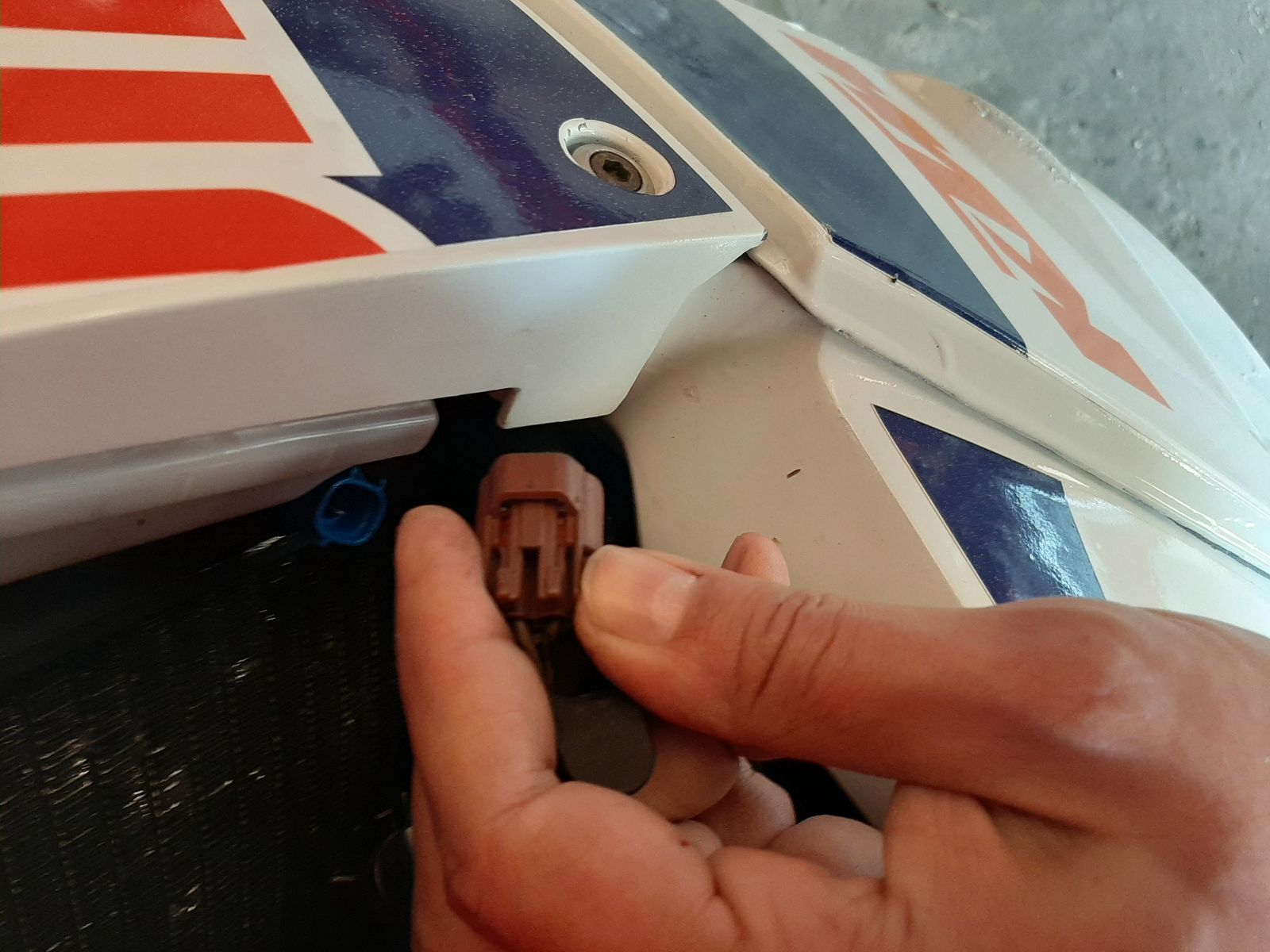 Das kleine braune Ding ist der Stecker. Abziehen und überbrücken, dann sollte der Lüfter anspringen. Wenn der Lüfter und Sicherung i.O. sind. Achtung es funkt beim verbinden ,der hat einen ordentlichen Anlaufstrom.