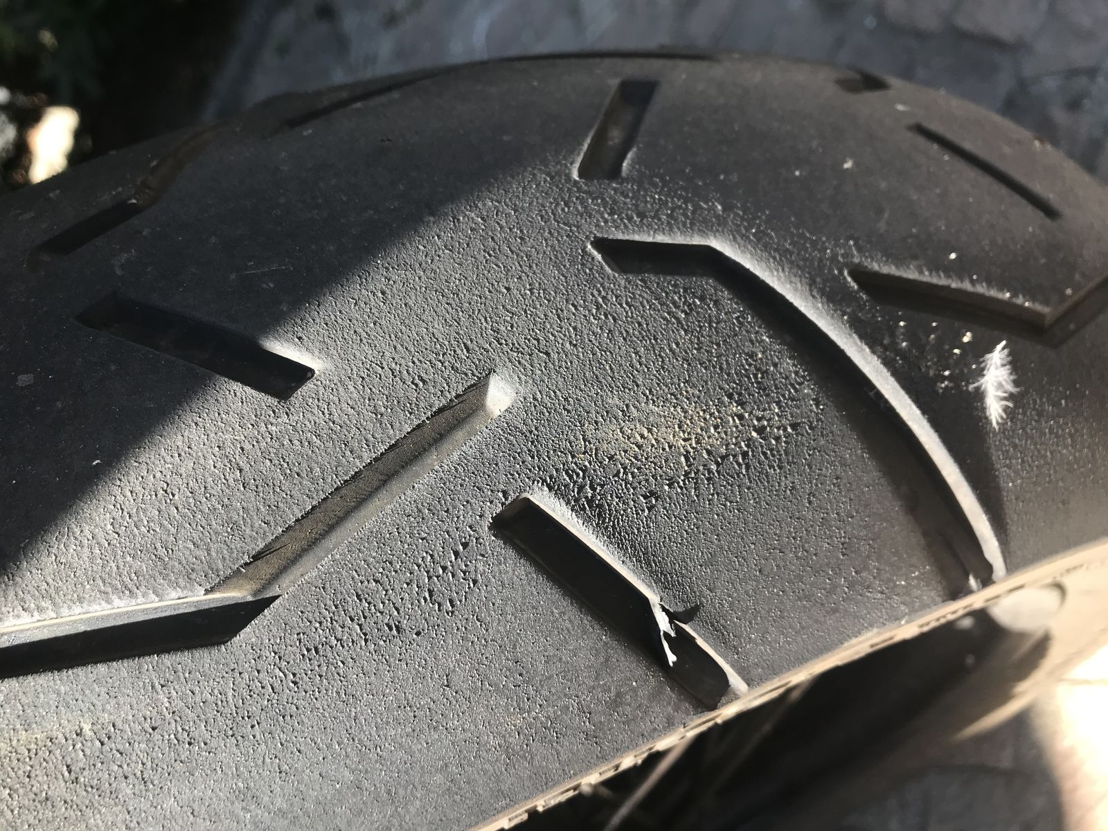 So nach 8.000 km müssen in ca. 500 - 1.000 km zwei Neue drauf. Vorne 2,1 mm, hinten noch 2,0 mm. Damit ist die Laufleistung echt in Ordnung und vor allem sind beide gleichzeitig fertig.