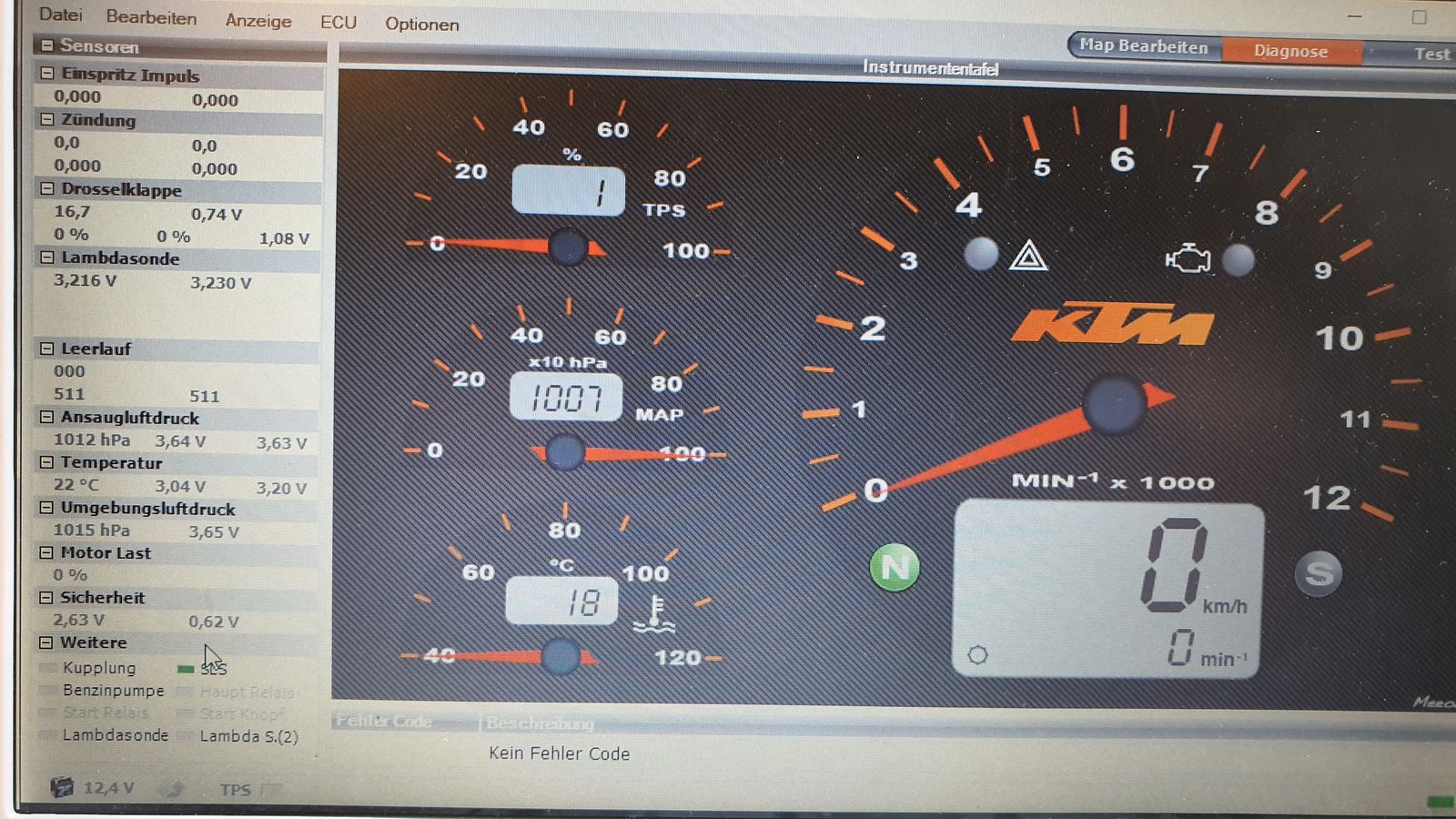 TuneECU ist da (die Kabel) und installiert. Ich habe jetzt erstmal die Werte ausgelesen (bei ausgeschaltetem Motor). Sind hier schon Auffälligkeiten? Die Volt-Angaben der Lamndasonden finde ich komisch. Laut Reparaturanleitung sollen hier Werten irgewo zwischen 0,5 und 1V anliegen oder geht das erst im laufenden Betrieb/ betriebswarm). Auf dem Bild nicht ersichtlich habe ich noch unterschiedliche Luftdruckwerte bei vorderem und hinteren Zylinder... Ein Bilder der Realwerte muss ich nochmal machen.