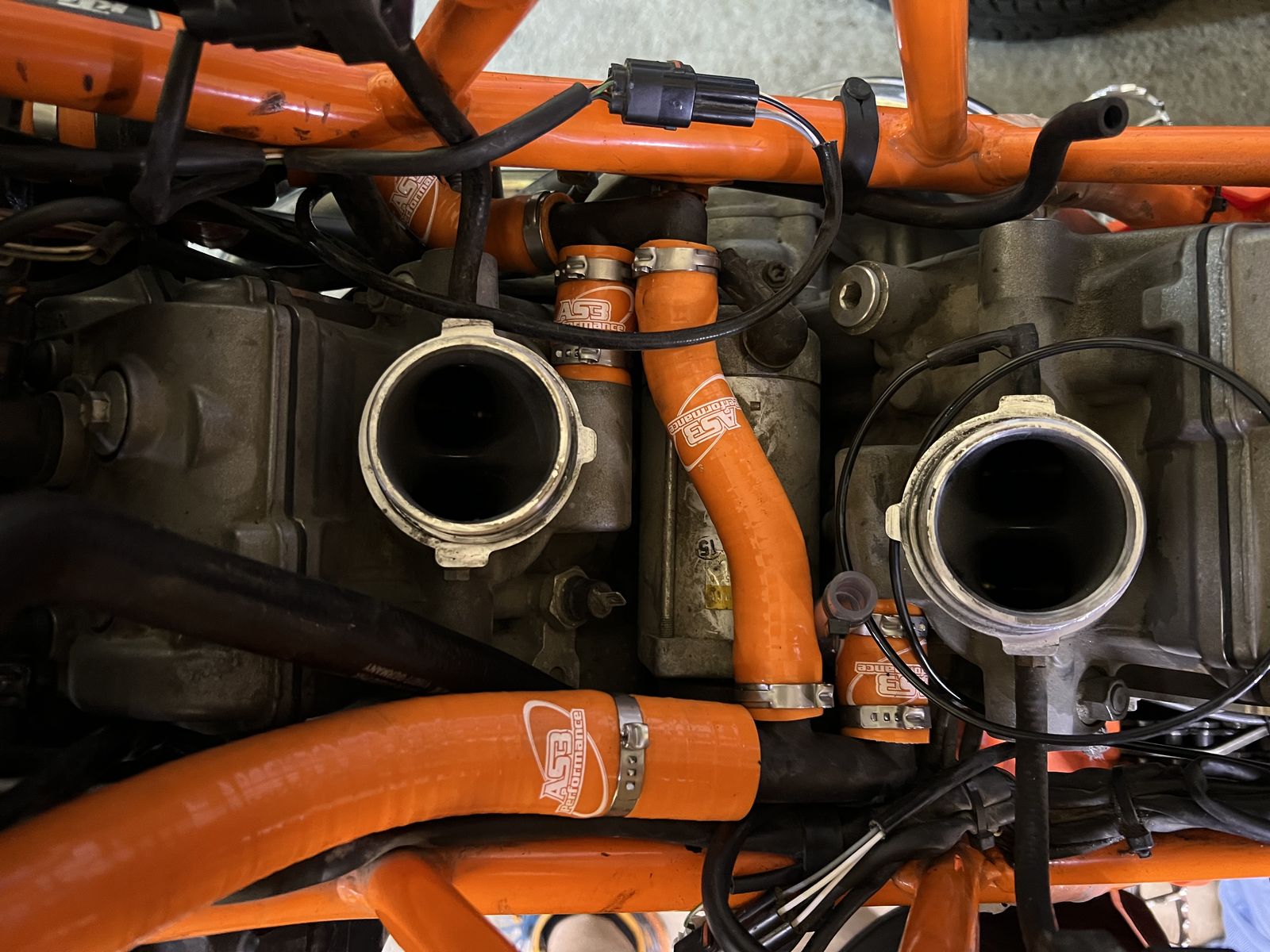 Hat mir auch erst schraubklemmen besorgt, war mir aber alles zu eng. Somit hatte ich mir schon Oetiker besorgt. Die Wandungen sind 1,5mm mehr, somit habe ich auch 3mm größere Klemmen genommen. Sollte man auch nicht bei KTM beziehen, das sind Apothekenpreise. Der kurze dicke Schlauch rechts am Kühler könnte etwas besser geformt sein, ansonsten passt alles sehr gut.