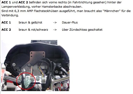 Den ACC2 konnte ich nicht finden?! Keine Ahnung warum nicht, aber einen anderen Stecker ohne Belegung, evtl. ist das ACC2 bloß ohne Fähnchen und anderen montierten Stecker. Bzw. evtl. läuft auch die Griffheizung über ACC2.