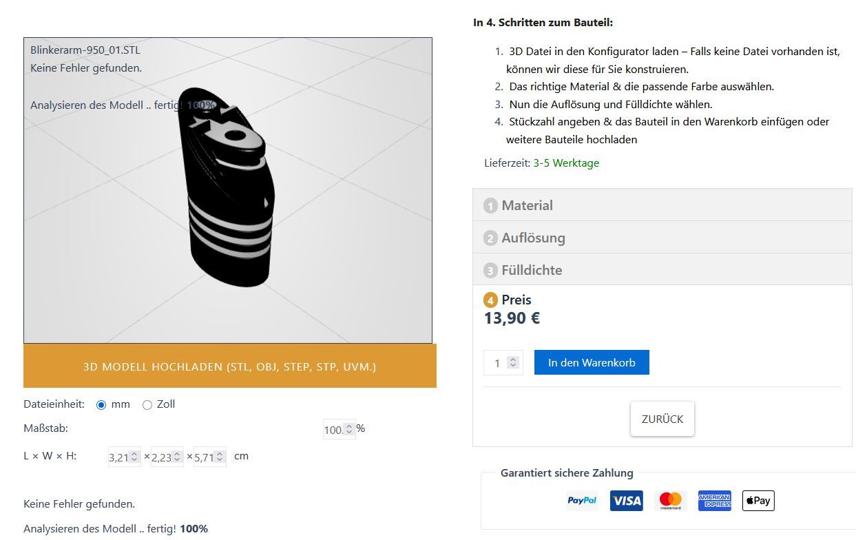 Der Blinkerarm ist laut 3DDesign24 in TPU druckbar und würde dort etwa 14€ zzgl. Versand kosten.