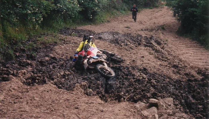 Der MT21 zieht wie gesagt im Schlamm nicht so toll und bei den Durchfahrten (gelegentlich lässt man es halt spritzen ) kam ich meistens quer aus den Wasserlöchern raus. Dass die Wasserlöcher besser zu umfahren sind, hatte man vor allem bei Peter gesehen, der sich mehrmals in einigen ablegte, somit gelegentlich ein unfreiwilliges Bad nahm und für viel Heiterkeit sorgte. Dafür stank er dementsprechend in dem abgestandenem Wasser . Er hat uns gelegentlich auch gezeigt, dass es gut ist, grossräumige Umfahrungen anzusetzen. Denn auch ne EXC lässt sich schwer rausziehen, wenn sie in einem tiefen Wasserloch festsitzt.