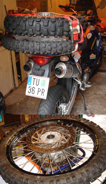 Hat auch tadellos funktioniert über 2000km. Das Hinterrad ist einfach auf den Kofferträger gestellt. Das Trägerrohr passt saugend zwischen Bremsscheibe und Speichen und sitzt dann auf den Halterungen der Bremsscheibe. Ein Stück alten Schlauch als Scheuerschutz dazwischen und hinten ein geschickt gesägtes Abfallstück Holz als Abstandshalter zum Kofferträger dazwischen geklemmt.