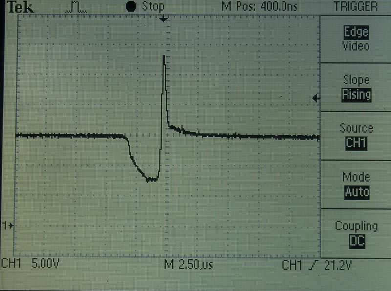Aber da das Oszi schon mal da war, habe ich auch die Akkuspannung bei laufendem Motor gemessen. Alle paar ms gibt es einen Spike von 20V bis 30V