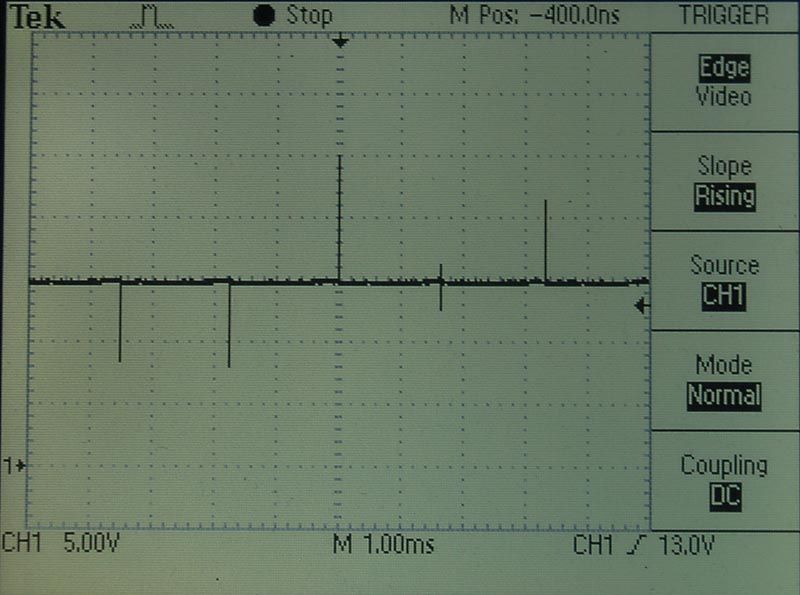 | Spikes bei eingeschaltetem Motor. Die Grösser der Spikes ist hier nicht erkennbar, da die Auflösung von Oszi nicht reichte. |