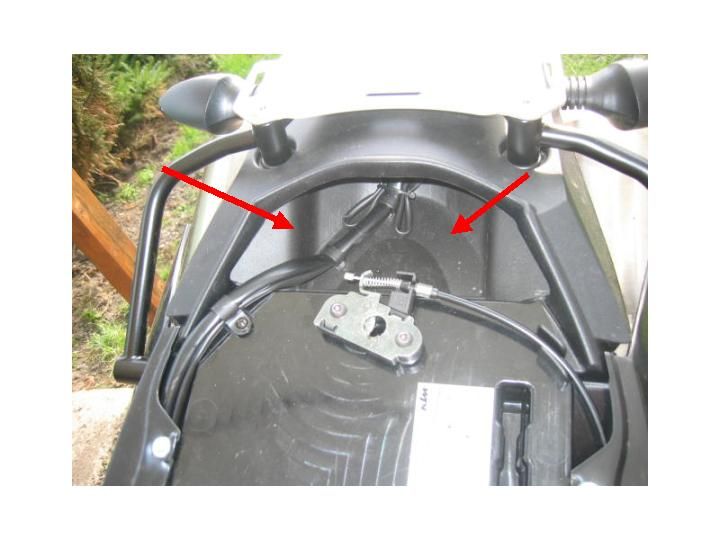 Die Sitzbank liegt nicht offen. Zwischen der Sitzbank und dem schwarzen Kst.-Teil liegt ja noch der Kotflügel, oder wie man das auch immer nennt. Durch diesen "Kotflügel" sind auch die Haltegriffe und die Gepäckplatte mit dem Rahmen verschraubt. Dieser sichtbare "Kotflügel", je nach Modell orange, schwarz oder blau bleibt erhalten, ist nämlich ein Teil mit der schwarzen Kst.-Verkleidung unter der Sitzbank, auf dem die Sitzbankverriegelung und das Werkzeugfach bzw. das ABS-Fach ist. Nur durch die Aussparung für die Kabel, die von Original-Teil verdeckt ist, kann event. Spritzwasser unter die Sitzbank kommen, was aber m.E. so auch passieren kann. Wenn Du die Sitzbank abnimmst, siehst Du hinterhalb, dort wo die Sitzbankverriegelung befestigt ist, diese Öffnung. |