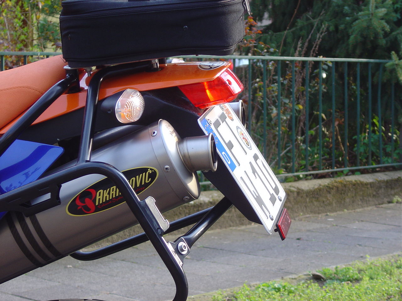 Ich wollte auf das Original-Plastikteil nicht verzichten und war auch etwas skeptisch, ob das Alu Teil einen Sturz im Gelände unverbogen übersteht. Ich hab also einfach ein anderes Rücklicht (natürlich mit LED-Lampe) adaptiert. Durch die Verwendung der LC4-Lampenfassung muß noch nicht einmal der Kabelbaum verändert werden.