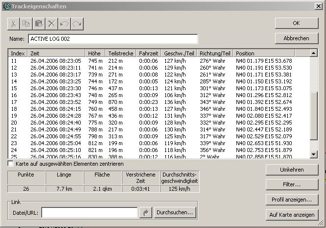 | Benzinschnüffler @ Mi, 10. Mai 2006, 21:55 hat folgendes geschrieben: | Was nix verstehen? Ich habe den Active-Log (also den ungespeicherten und ungekürzten) angeschaut und da ist die Dichte der Punkte unterschiedlich. Das gleiche Muster ist aber auch beim gespeicherten Track (700 Punkte) zu sehen, allerdings bei insgesamt weniger Punkte. |