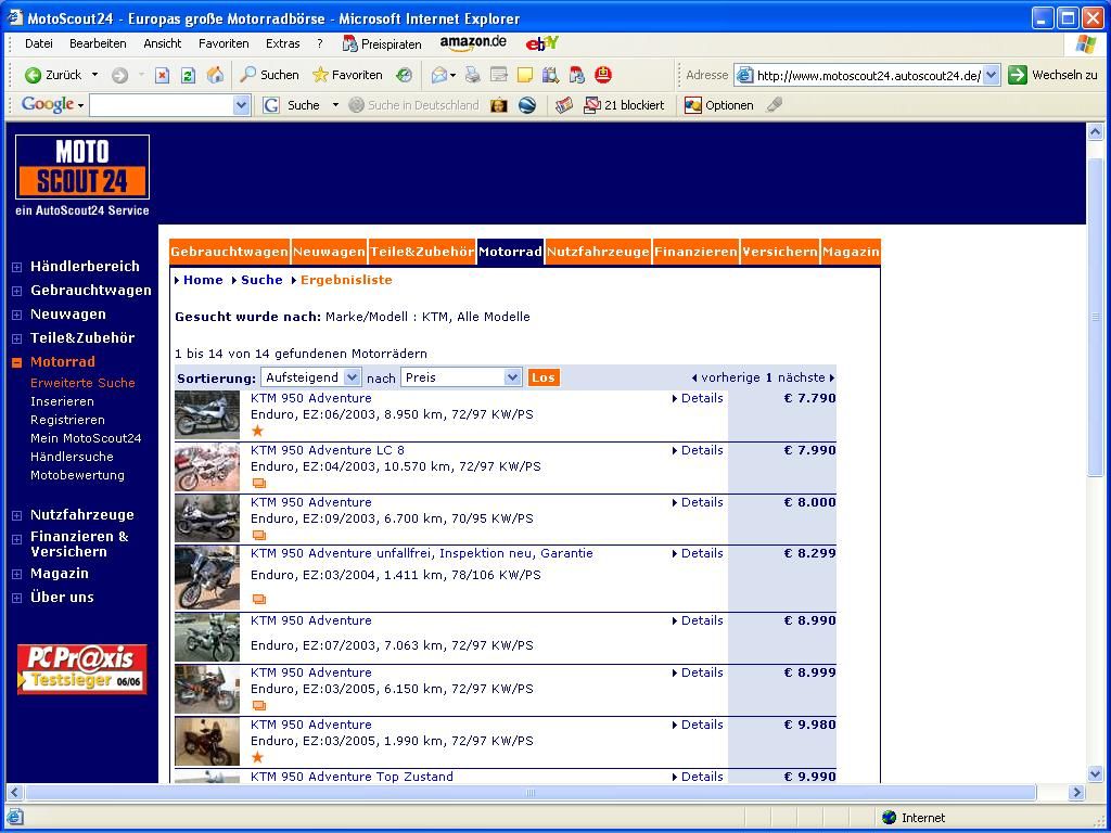 Er verkauft eine 05er mit 2700km für 4400,-€. Das Motorrad steht in London (obwohl als Standort Alsdorf drin steht), hat aber dt. Papiere. Das Mopped soll 100%ig in Ordnung sein. Die Kaufabwicklung würde über motoscout ablaufen, man muss das Geld überweisen und ein paar Tage später würde das Motorrad geliefert (Lieferkosten schon im Preis enthalten). Da das ganze über motoscout ablaufen würde, wäre alles versichert... Sehr fragwürdige Geschichte...Würde ich wohl nie machen, man hört gerade bei dieser Gebrauchtbörse immer wieder von Neppern...