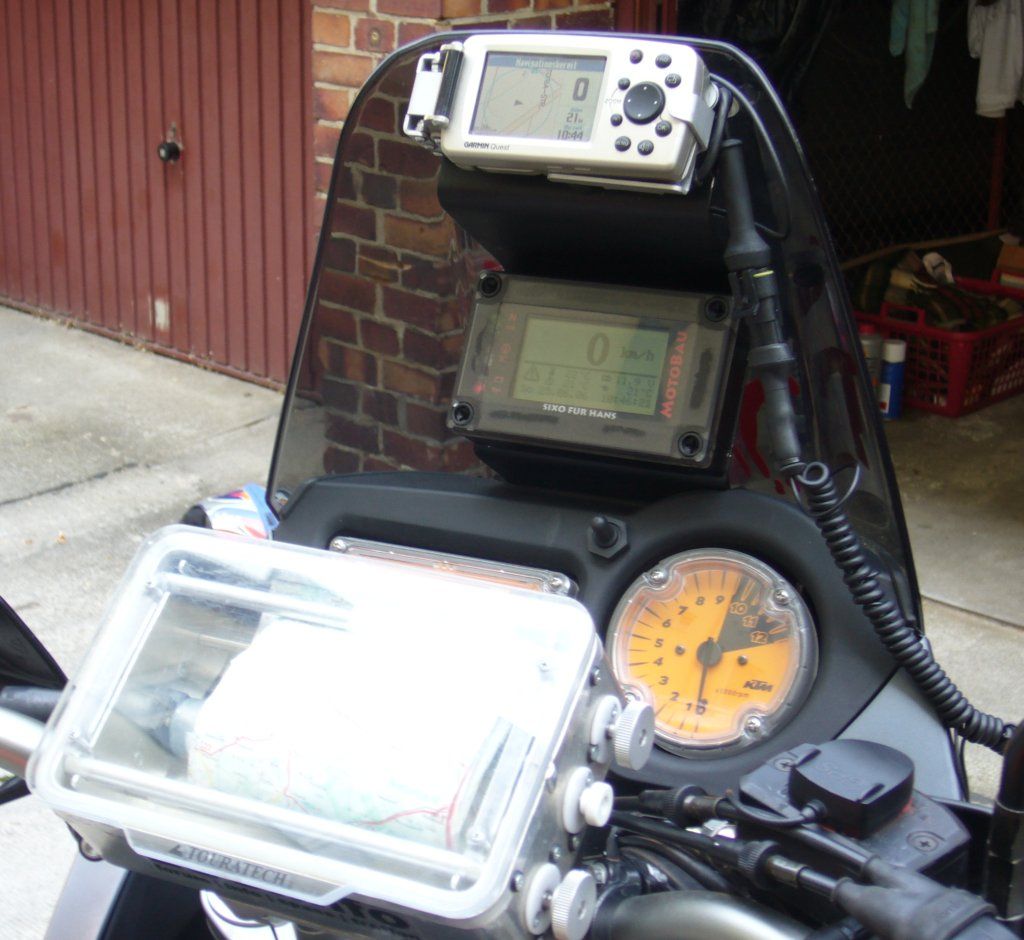 Der Quest mit der Halterung von Touratech sitzt jetzt oben an der Windschutzscheibe gut im Sichtfeld. Er startet bei eingeschalteter Zündung. Die wackelige Klappantenne des Quest benutze ich nicht mehr. Dafür sitzt jetzt eine GPS-Maus auf dem Deckel des Bremsflüssigkeitstöpfchens. Das schwarze Geraffel neben dem Navi ist mein Kopfhörerkabel am Audioausgang.