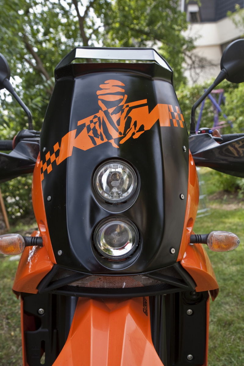 Habe eine Rallymaske vom KTM-Bastler machen lassen (tolle Arbeit – danke, Steffen), gebrauchte Seitenteile und Halter einer Adventure gekauft, das ganze möglichst klein geschnitten, mit zwei Edelstahl-Auspuffschellen von einem Jeep um den Lenkkopf geschraubt – ja, und natürlich lackiert und passender Aufkleber drauf.