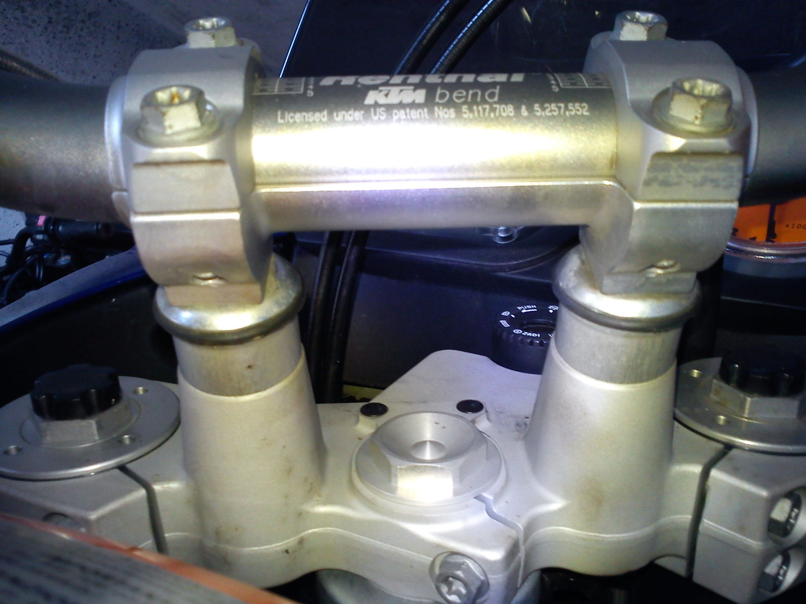 Ach ja: lacht jetzt nicht, aber ich hab, glaube ich, bereits eine Lenkererhöhung drauf. Nachdem das meine erste Adventure ist weiß ich das eben nicht so genau, aber so wie es aussieht ist das nicht Auslieferungszustand (siehe Bild). Ich hatte leider nichts zum Messen in der Garage, aber so rein nach Augenmaß würde ich sagen das es ca. 30mm sind. Ich hätte aber nichts gegen etwas mehr, deswegen die Frage:
