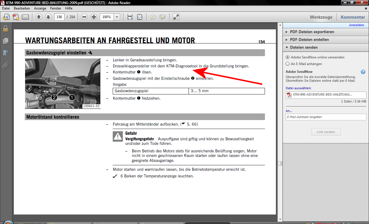 Wenn die (in etwa) 2-5mm Spiel nicht stimmen, dann aber nicht gleich selber nachjustieren! Davon hängt die Drossel-Klappen-Nullstellung ab. Das Justieren nur in einer KTM Werksatt machen lassen!!!!!