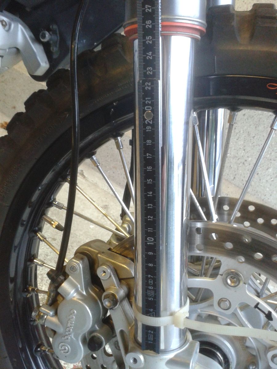In meiner Verzweiflung habe ich schon bei einer GS 800 nachgeschaut, die hängt richtig in der Feder, wenn sie vom Ständer kommt. Und die hat ja noch weniger Federweg.