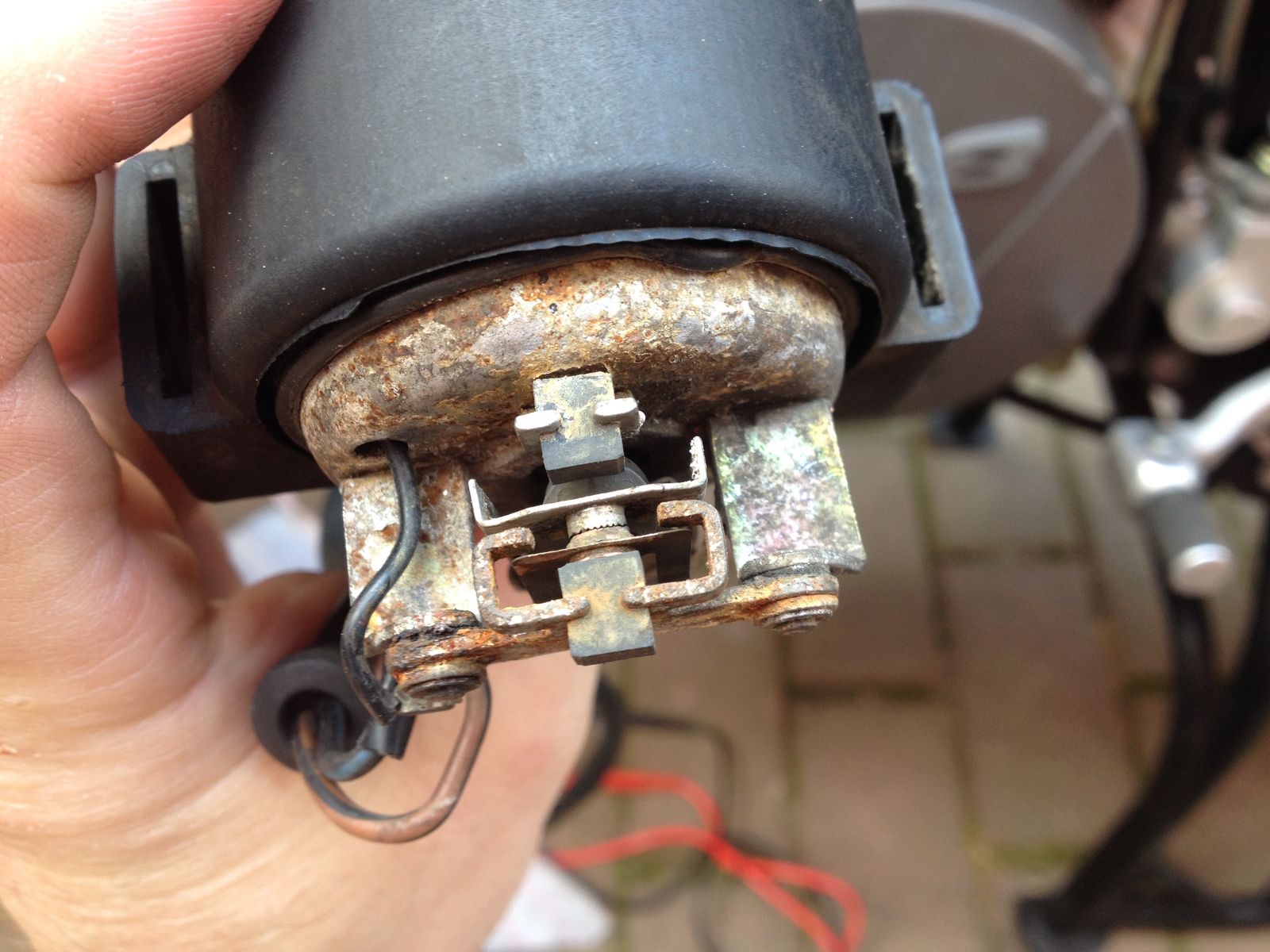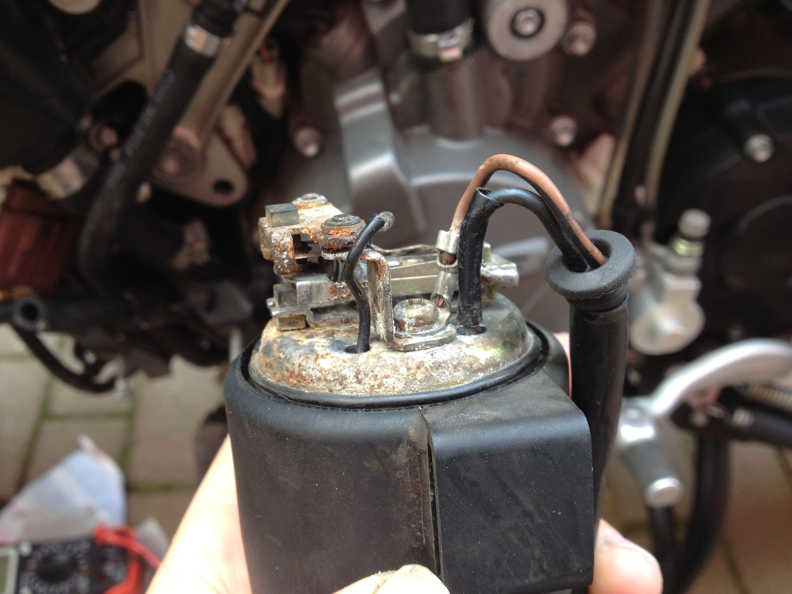 Die Kontakte sind derart korrodiert, da würde ich erstmal die Pumpe instandsetzen und schauen, ob sie dann läuft. Erst wenn sie das wider Erwarten nicht tun sollte, würde ich das Benzinpumpenrelais ausbauen und prüfen (hinterm Scheinwerfer in Fahrtrichtung gesehen das linke der beiden Relais). Beim Einsetzen der Pumpe in den Halter passiert es leicht, daß der Deckel sich etwas verschiebt und unbemerkt undicht wird, also sorgfältig arbeiten bei der Wiedermontage. Den kurzen, transparenten Entlüftungsschlauch habe ich an meiner 950S verlängert und ganz nach oben an den Lenkkopf geführt, mit einem kleinen Bogen abwärts.
