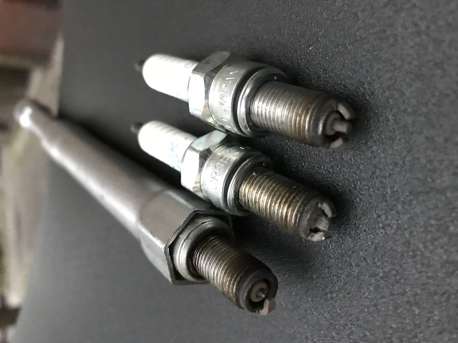 habe mal Bilder gemacht von der hinteren Zündkerze sowie von den beiden vorherigen Kerzen. Für die vordere Zündkerze hatte ich heute keine Nerven und nicht genügend Licht mehr. Die Kerze auf dem Werkzeug ist die aktuelle hintere, die beiden "losen" die alten.