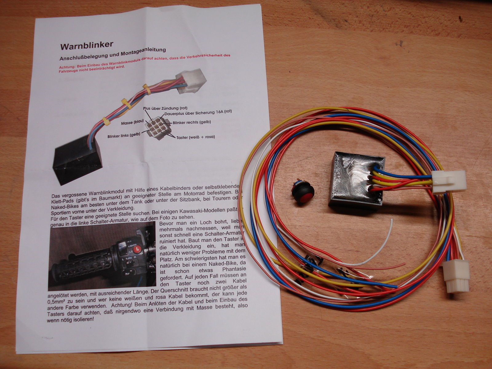 Eine Warnblinkanlage muß also her. Durch einen Heizgriff-Fred hier im Forum bin ich dann auf die Seite vom Volkmar gestossen. (http://www.volkmarheinz.de/)