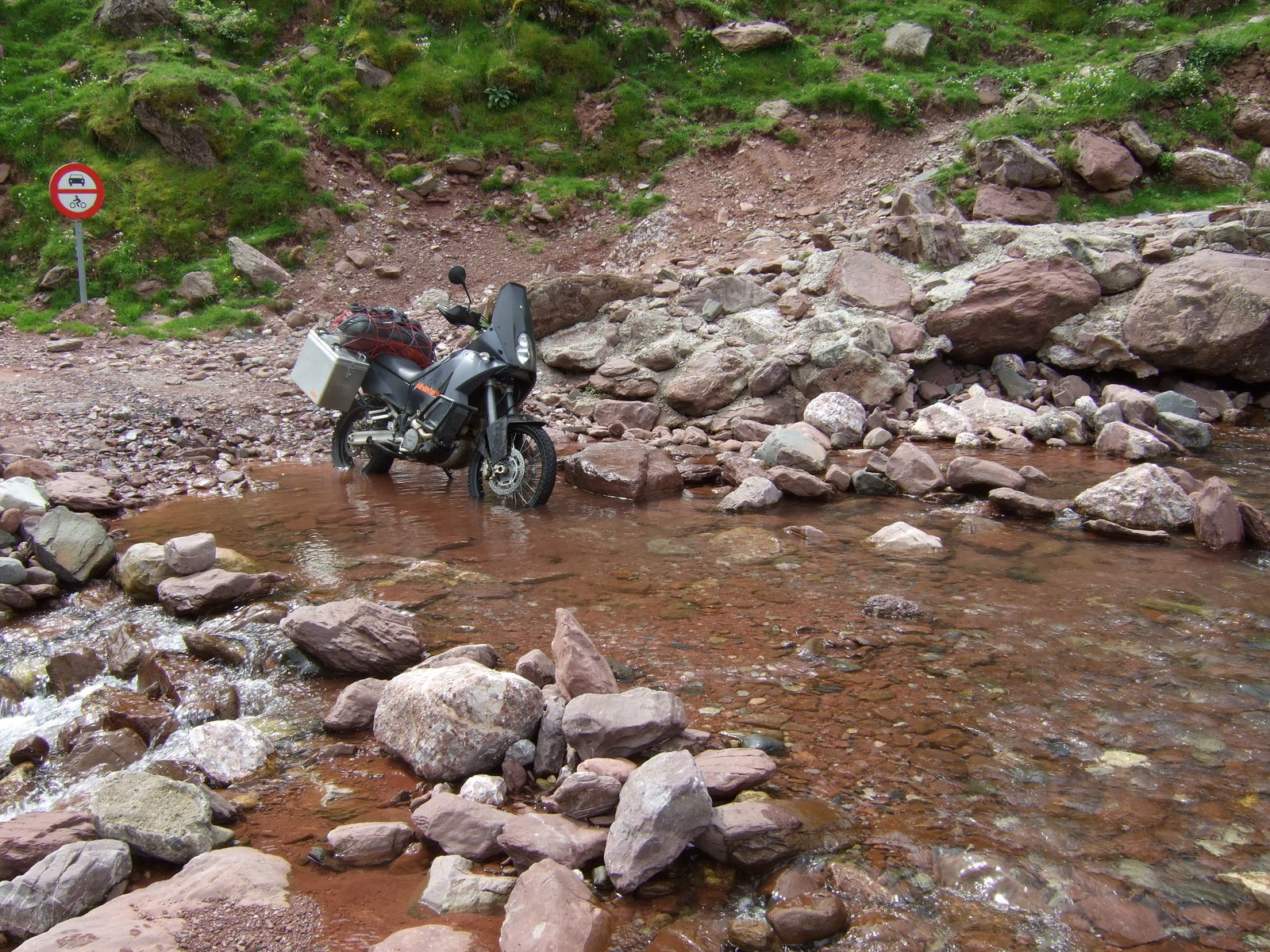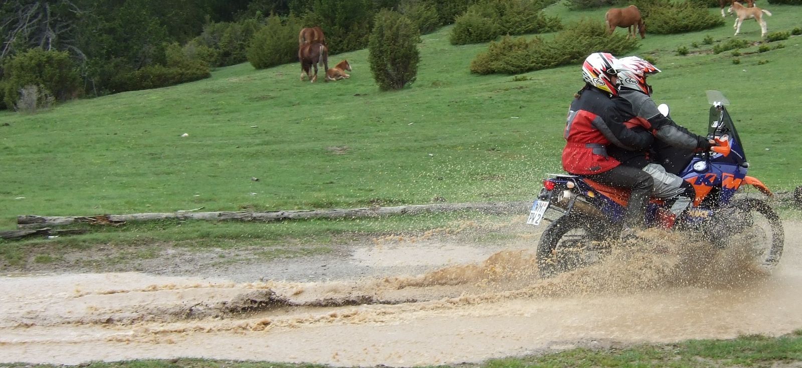 Der Tag also, an dessen Ende ich Andreas und seine langjährige Sozia Bettina traf ... lange hatte ich mich im schönen Valle de Echo herumgetrieben, nach legalen Ausgängen suchend. Immer wieder Sackgassen, aber ich hatte ja Zeit, dachte ich. Als wir am Nachmittag wieder Kontakt hatten (d.h. ich aus dem riesigen Funkloch im Valle de Echo heraus war), stellte sich heraus: Unser Treffpunkt ist nicht vor Sort, sondern bei Leu Seu den Berg hinauf in Castelbo (das auf meiner Karte und allen Karten, in denen ich an Tankstellen stöberte, fehlte), sprich: Ich hatte noch einen Paß, im Grunde eineinhalb Pässe mehr vor mir als erwartet. 250km Paßfahrt, nachmittags um halb 5. Eigentlich kein Problem, aber außerdem schwere Gewitterwolken in alle Richtungen. Auf der Fahrt wurde ich in heftigen Schauern und einem langanhaltenden Regen 5mal patschnaß und ließ mich 4mal wieder im Fahrtwind stehend trockenföhnen. (Das muß man der Rukka Air Kombi lassen: Sie läßt zwar Regen rein bis zur Membran, aber nach 10km ohne Regen ist sie auch wieder trocken, wenn man stehend fährt.)
