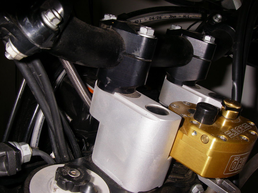 ist schwer zu messen. Das Einzige, was geht ist, die Lenkerenden in vertikaler Richtung zu belasten. Da ist dann bei einem 805mm langen Lenker ungefähr 15mm (also+/-7,5mm) Weg zu verzeichnen. Die Dämpfung soll aber laut Hersteller in alle 6 Richtungen arbeiten. Die verbauten gelben Gummis sind die mittlere Stärke. Gibt es noch in ROT=hart und GRÜN=weich. Eine EXC400 mit den grünen Gummis fährt sich wie ein Elektrobike . Mit den gelben Gummis ist kein Eigenleben des Lenkers zu merken. Nur die Vibs sind auf ein sattes Drittel geschrumpft . Das Teil gibts wie abgebildet von KTM und in schwarz direkt beim Hersteller: http://www.xtrig.de/index.php?lang=DE&uid=452378767a4f80a2978208ee14c31f73&page=shop&id=&ucat=&pid=19. Dazu gibts dort noch ein paar Lenkererhöhungen und eine nicht gedämpfte Lenkeraufnahme(Foto). Achtung: das Schwarze Teil passt nicht auf die gefräßten Gabelbrücken von KTM/Husaberg.