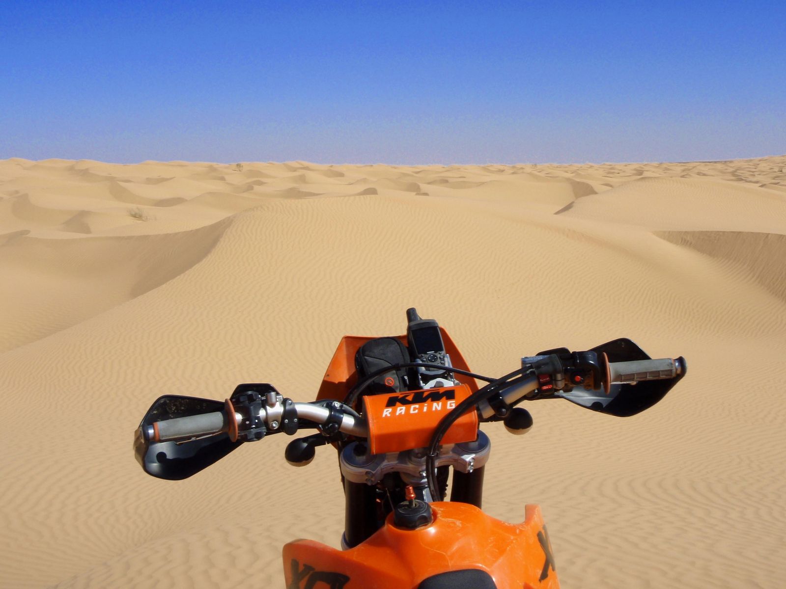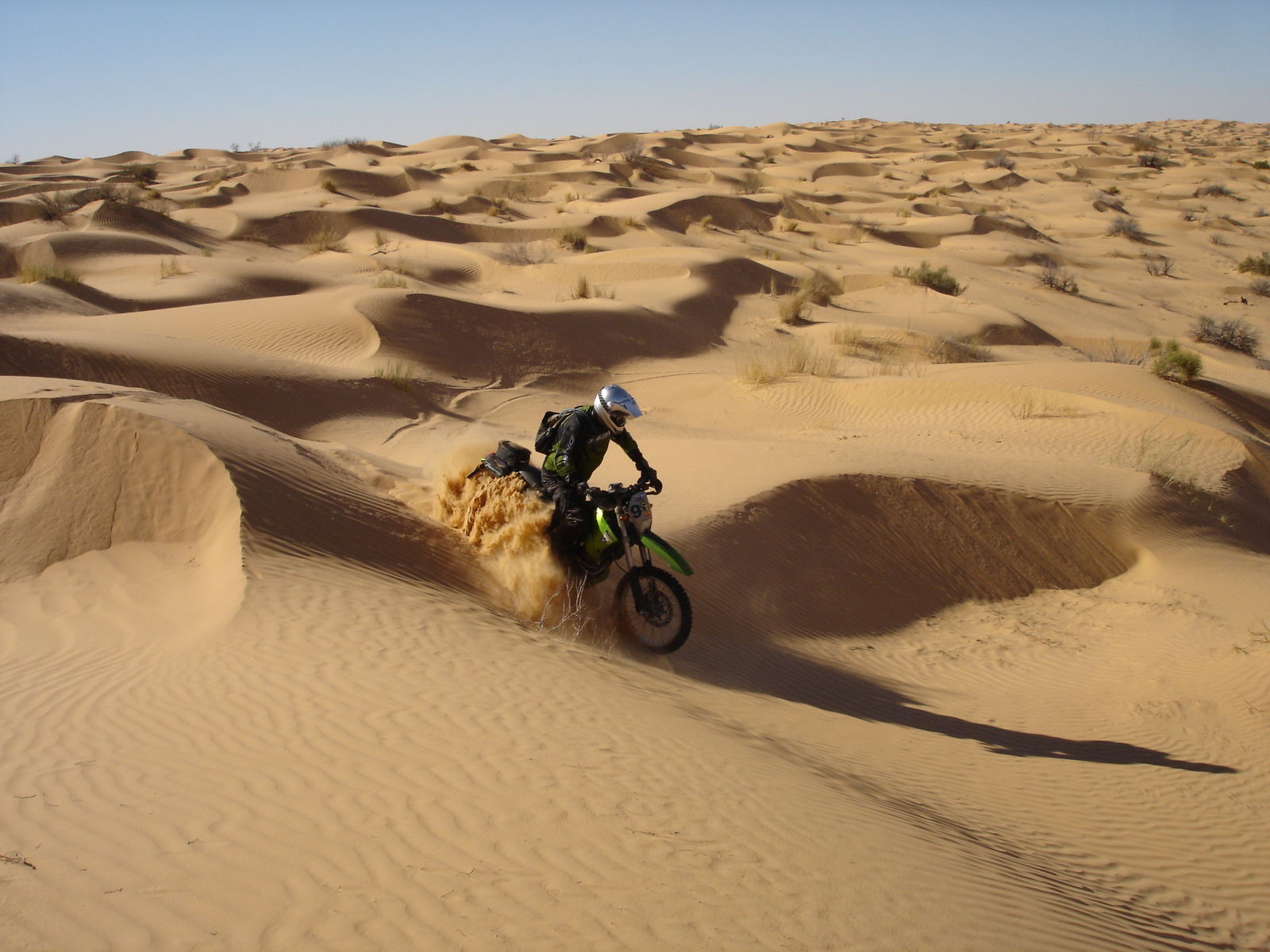 zum Reifen: Das Terrain in Tunesien is recht unterschiedlich, Asphalt, verschiedenartige Pisten, Steinwüste und schwerer Sand gehen prima, im Feinsand, wo es drauf ankommt, ist ein neuer MT 21 nicht ganz so gut, ein reiner Sandreifen trägt besser und gräbt nicht so.