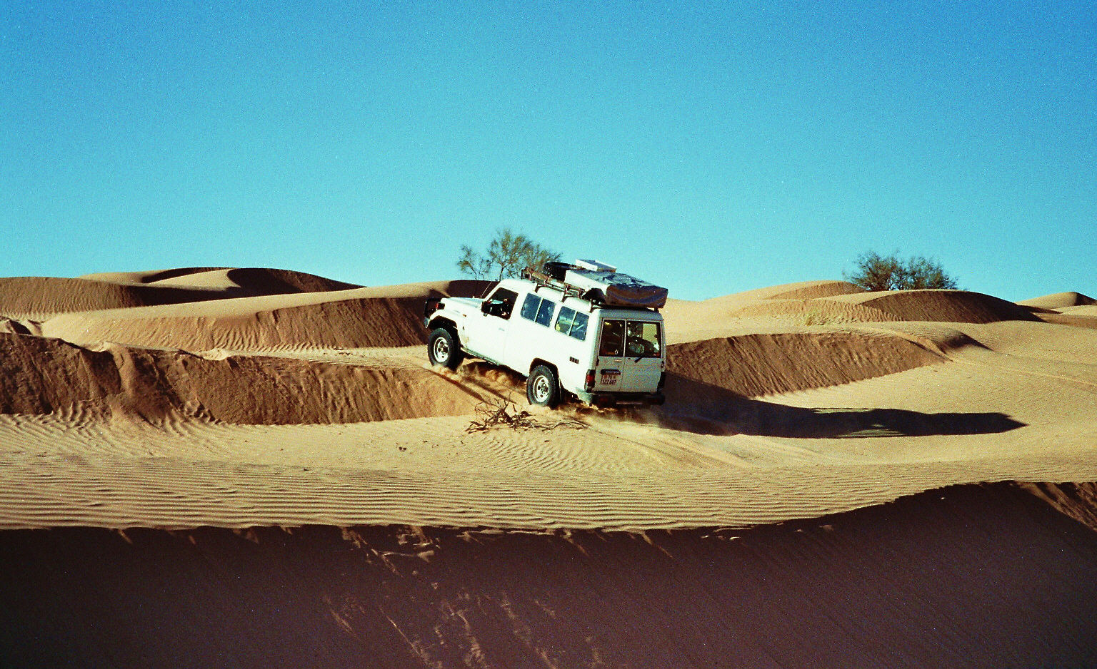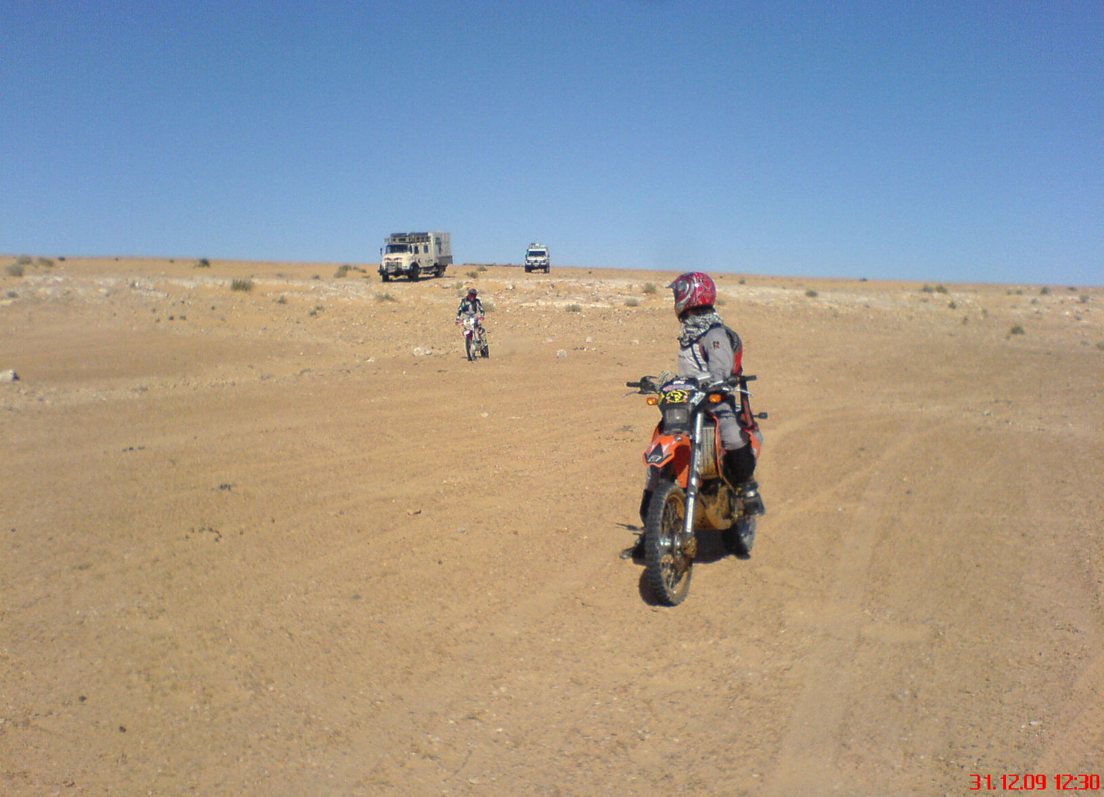 Ich gehe je nach Gefühl mal eher schlafen mal sizte ich bis nach Mitternacht am Lagerfeuer. Ich schlafe meist gut und plage mich nur etwas mit dem zuvielen Gepäck rum, man brauch hier wirklich nich viel. Früh gehts meistens so um 9 raus und gegen 11 ist dann Abfahrt. Tagsüber gibts immer eine große Picknickpause und die Bikes werden aus den Kanistern betankt. Alles ist da, man muß sich aber um sich selbst kümmern, man bekommt nichts hinterhergetragen, z.B. Luftdruck, Öl, Wasser, Isotrink, Riegel, die man hier auch wirklich braucht. In der Regel läuft alles ziemlich schnell, aber gut organisiert ab und mit der Zeit kommt man rein und es geht alles schneller, so dass sich auch individuelle Freiräume ergeben, z. B. mal ne Stunde einfach nur so in die Dünen liegen oder Tagebuch schreiben, es ist ja alles so interessent und anders als man es von zu hause gewohnt ist und zelten war ich auch schon lange nich mehr. Den anderen Fahrzeugen mitzuhelfen oder auch mal zuzuschauen, wie man mit der Winde arbeitet und einen vergrabenen Landcruiser befreit.