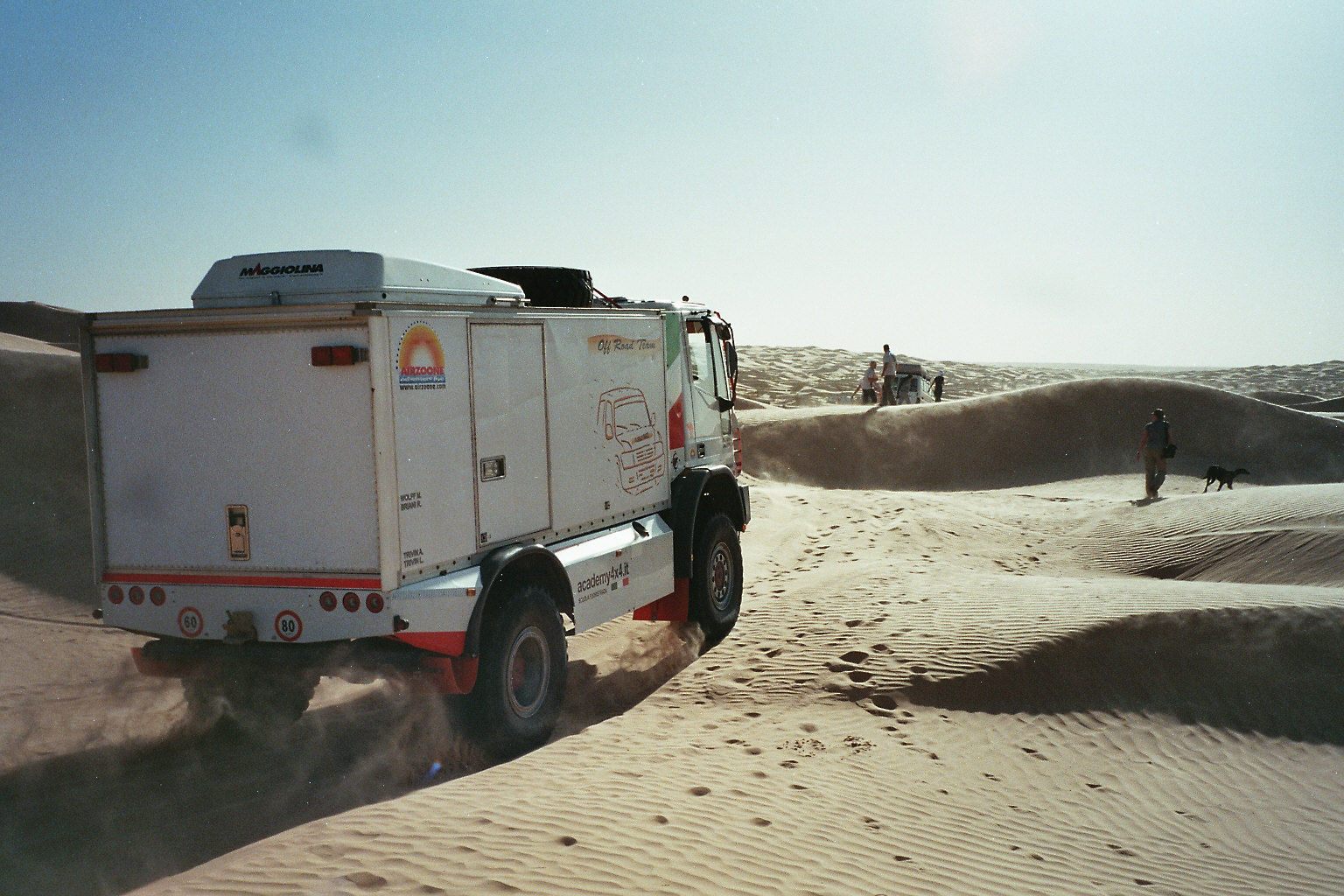Tag 2: Es ist unglaublich, wenn man sich diese Dünenformationen anschaut, kommt ständig die Rückmeldung aus dem Gehirn: „das geht nicht, das geht jetzt wirklich nicht mehr“ - kurz darauf kommt der Freddy mal fluchend, mal grinsend mit dem Rundhauber mit tonnenschwerer Ladung spektakulär drübergeschaukelt. Dünenkämme werden zurechtgeschaufelt, Sandbleche gelegt, Neigungswinkel und Verschränkung voll ausgeschöpft. Mitreisende Ehefrauen können teilweise nicht dabei zusehen, was mit den Fahrern und Fahrzeugen passiert. Beim Rundhauber reist die Führerkabine aus den Ankern, es geht trotzdem weiter.