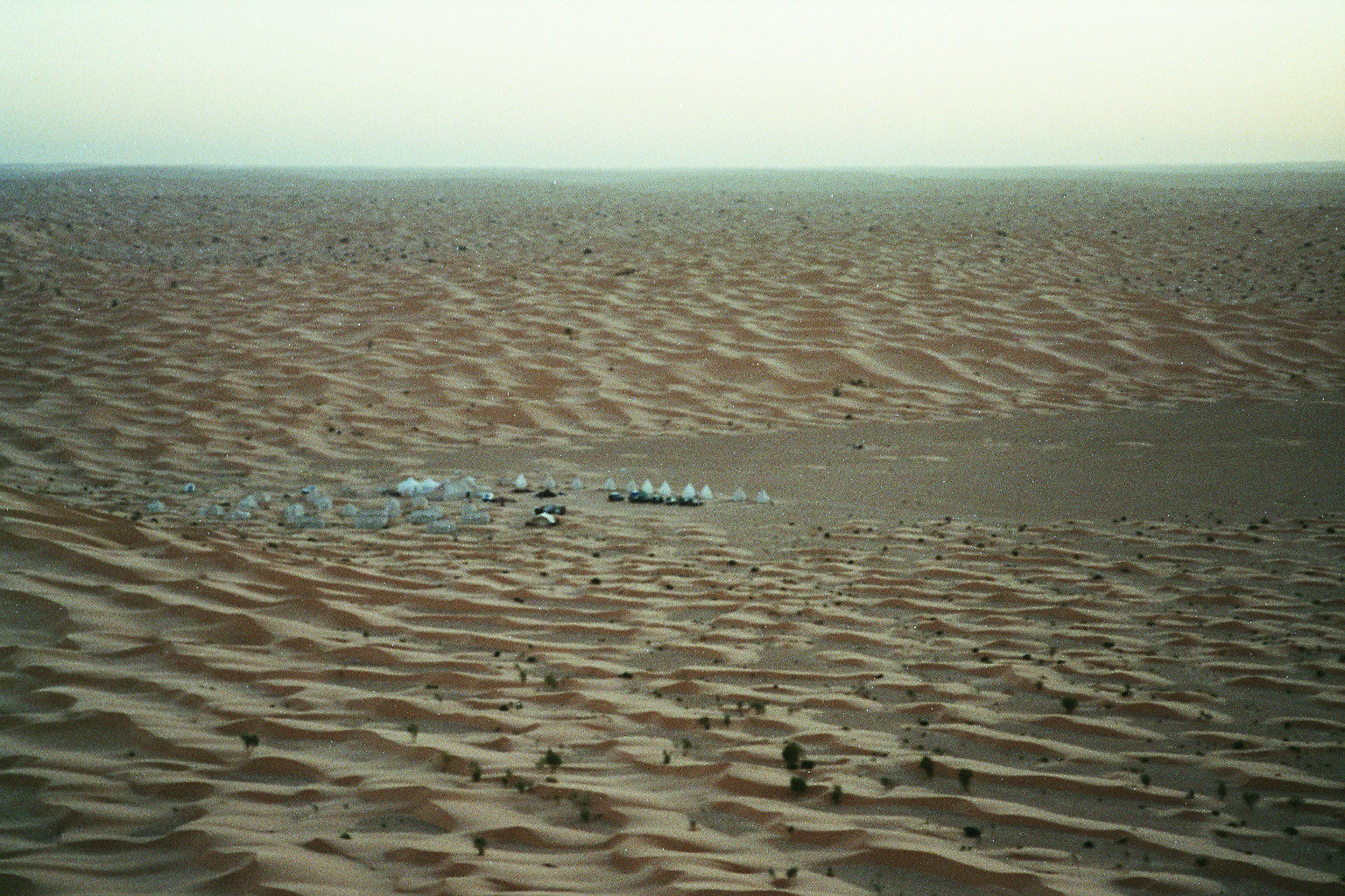Weiter geht’s zum Höhepunkt der Sahara „extrem“ Tour südlich in Richtung El Borma, Ziel soll der Rote See (Lago, Lac Richet oder auch Ain Ouadette) sein. Heute gings zeitig los. Nun macht die Tour seinem Namen alle Ehre, keine Pisten mehr, nur noch hohe Dünen, dutzende anstrengende und atemberaubende Dünengürtel, die sich mit wenigen Ebenen abwechseln, werden überquert, wir schaffen etwa 30 km pro Tag. Die Mitfahrer und die und begleitenden zwei Beduinen laufen voraus und suchen zusammen mit den Motorradfahrern Meter für Meter fahrbare Teilrouten. Nach einem Tag Kampf gegen die Dünen haben wir etwa die Hälfte geschafft und campieren an einem hohen Dünenzug. Ich bin auch total geschafft und gehe zeitig schlafen.