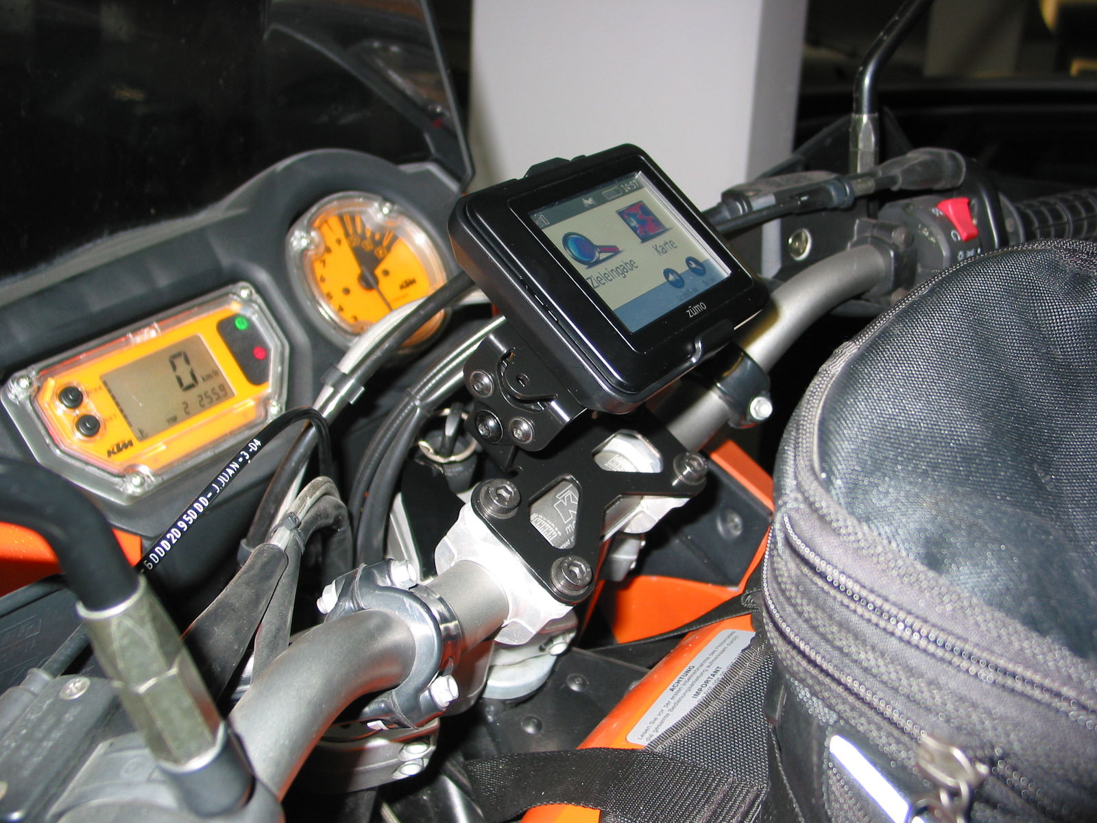 ich hab mich für die Montage mit dem sw-motech GPS-Halter Nonshock entschieden. Das Ding kostet bei Polo 39,95 € und ist wirklich einfach zu montieren. Auch mit KTM-Tankrucksack sind Tacho und Drehzahlmesser zu 100% ablesbar.