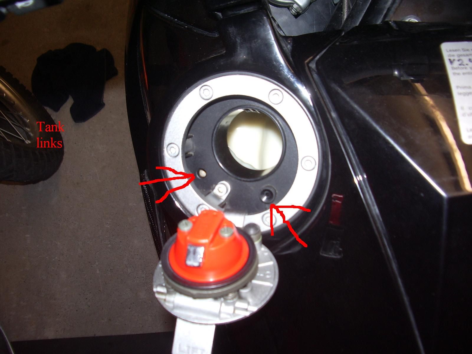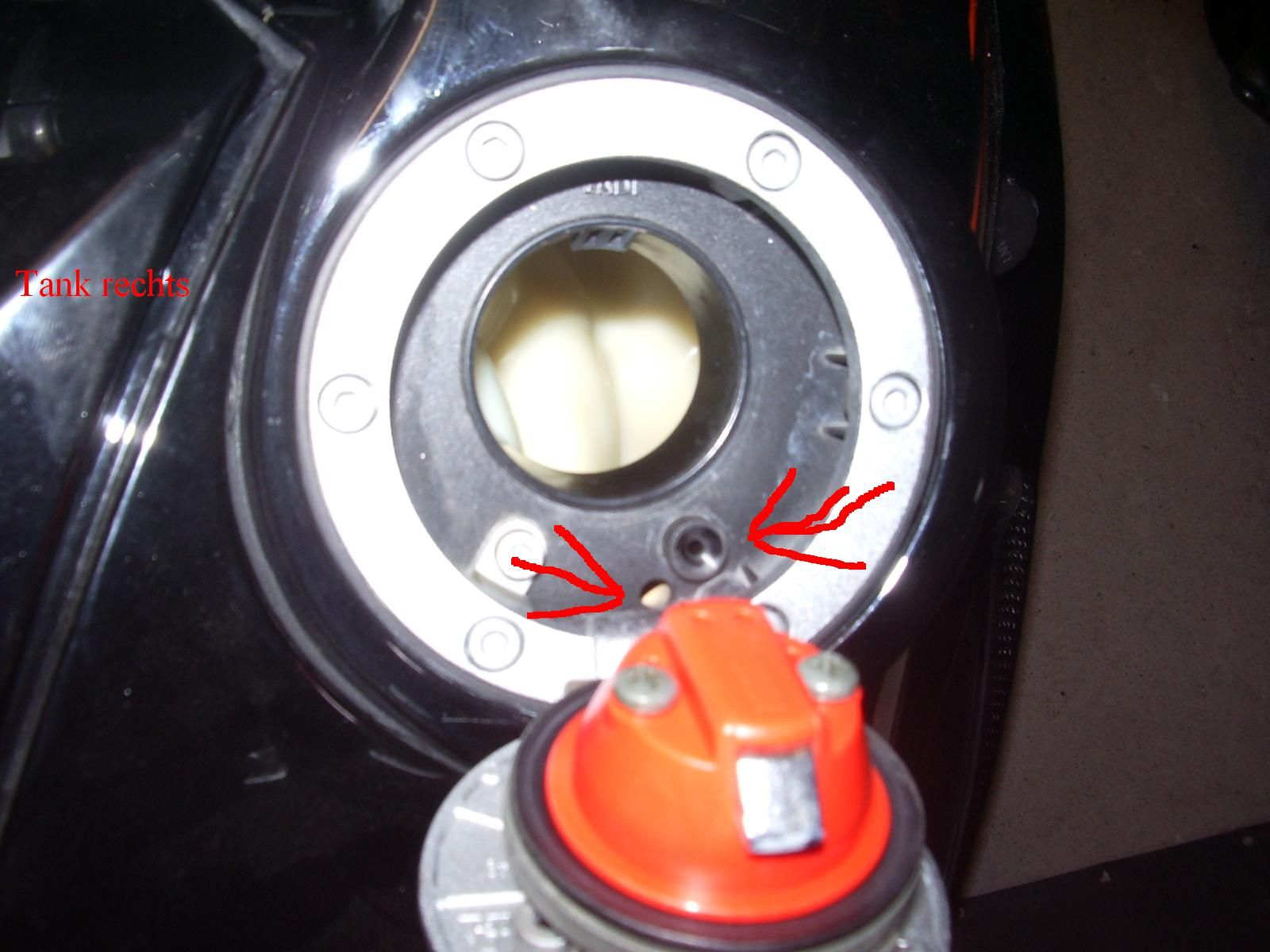 Falsch verlegte oder geknickte Entlüftungsschläuche wurden schon öfter als Ursache genannt. Wenn das nicht hilft, die Innereien des Tankdeckels öffnen und die winzigen Entlüftungskanälchen säubern (rote Plaste auf Froschis Bilder entfernen). Davor nicht vergessen die Tanköffnung mit einem Lappen zu stopfen . In diesen Kanälchen kann sich Dreck sammeln und dann nutzt eine saubere Entlüftungsschlauchverlegung auch nix. |