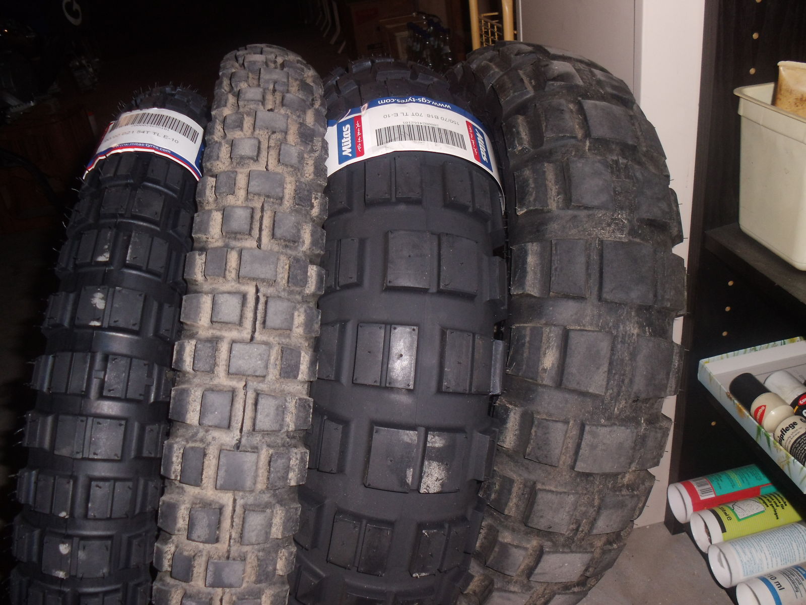 Ein Satz Mitas E10 sind gerade unterwegs zu mir als ADV Jüngling. Derzeit montiert sind TKC 80, hinten fast runter, vorne gut. Der vordere führt erstaunlich gut, auch bei winterlichen und schmierigen Bedingungen im leichten Gelände. Hinten....geht leider gar nicht, zu mindestens nicht für meinen Einsatzgebiet mit viel Geländeanteil. Trocken Strasse und trocken Schotter mag gehen. Naja, wenn man den kennt, kann man mit bisserl provozierenden Gaseinsatz auf der Strasse im Winter ein bisserl Spass haben...