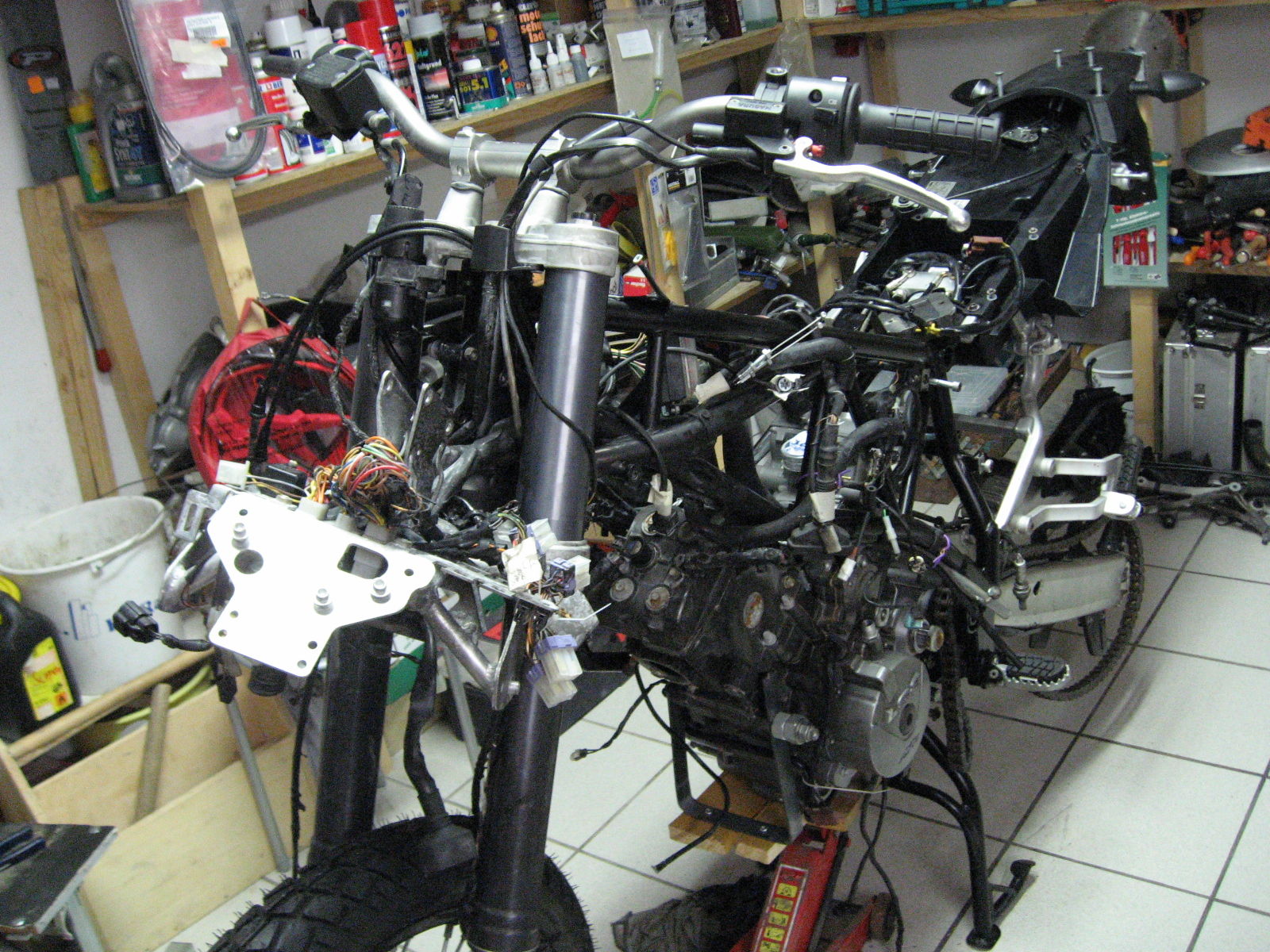 Ok, habe ich mir vielleicht zuviel Arbeit gemacht, aber beim Einsetzen des Motors dann auch noch auf den Kruemmer zu achten, habe ich mir gerne erspart. Motor lag auf Eisenbahnbohle und Autoreifen und habe dann den Rahmen druebergeworfen. Halt so eine semiprofessionelle Werkstatt