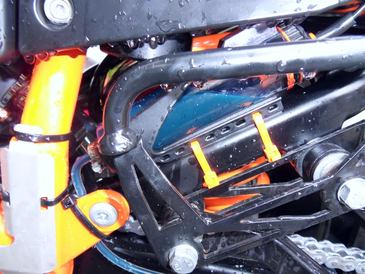 Hab an meine neue "R" , zusammen mit dem Mechaniker, den KTM Kit drangebaut. Vergiß die Halterung des KTM Kits........da sitzt der Tank noch näher an den Rahmen-Verstrebungen und es hat gut ne Stunde gedauert, bis wir ne einigermaßen Lösung gefunden hatten, die beiden Schläuche so zu verlegen, dass sie nicht in Krümmer-Nähe kamen und dadurch auch nicht allzu heiß werden. Ne längere Fahrt habe ich noch nicht gemacht, aber ich denke es wird so i.O. sein.....ähnlicher Abstand der Schläuche von dem Öler zu dem Krümmer, wie bei meiner Ex 2009er.