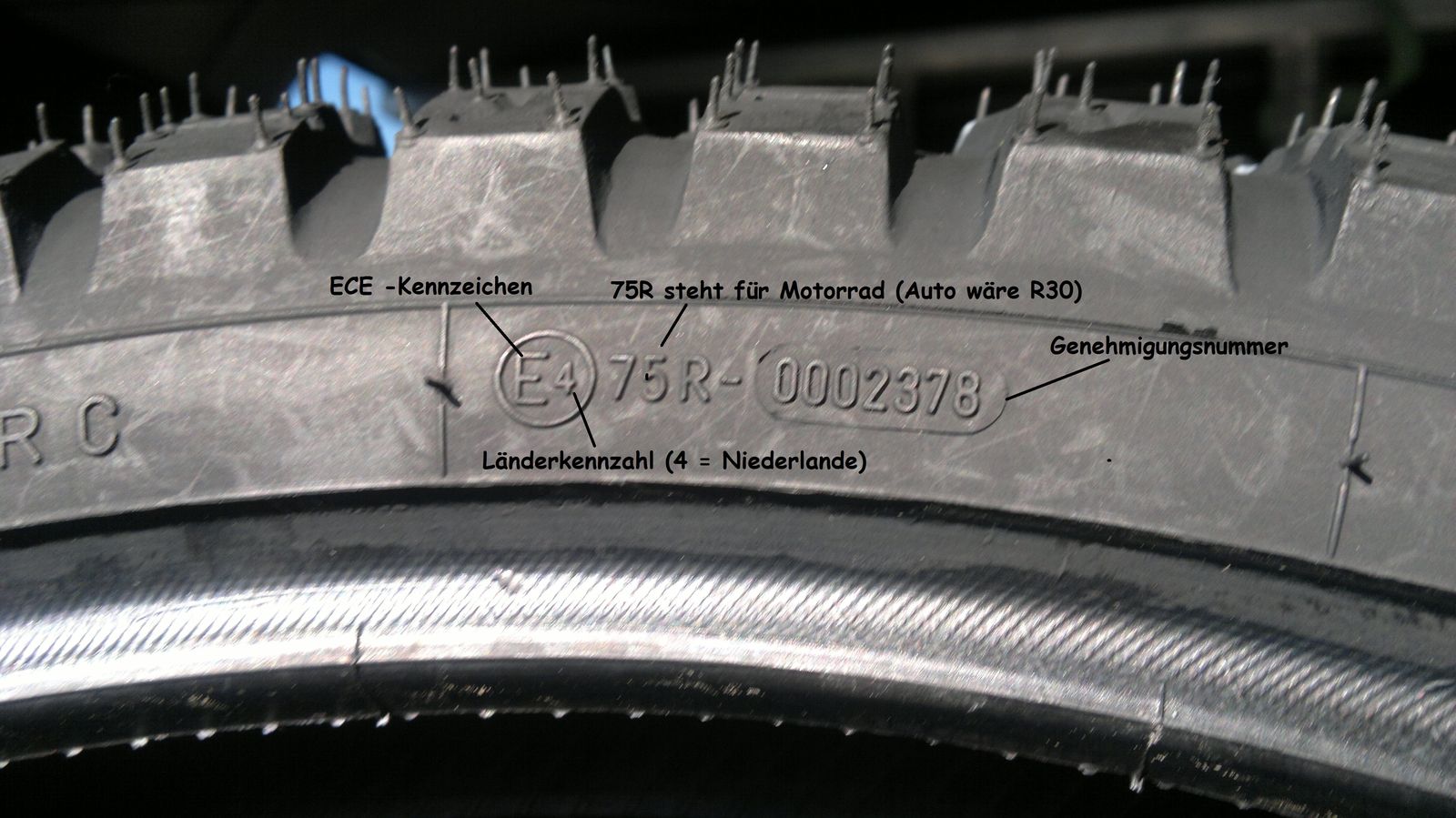 Warum sollte der Reifen nicht zugelassen sein ? Welche Nummer bei der Kennzeichnung E4 fehlt denn Deiner Meinung nach ? Die Bezeichnung 150/70-18 M/C 70R E4 75R, führt die benötigten bzw. vorgeschriebenen Daten, also die Größe, den Geschwindigkeits-und Loadindex auf und sagt auch aus, dass es hierbei um einen homologierten Reifen für Motorräder handelt. Allerdings müsste noch irgendwo die Bezeichnung TT oder TL, also für Schlauchreifen oder schlauchlosen Reifen angebracht sein.