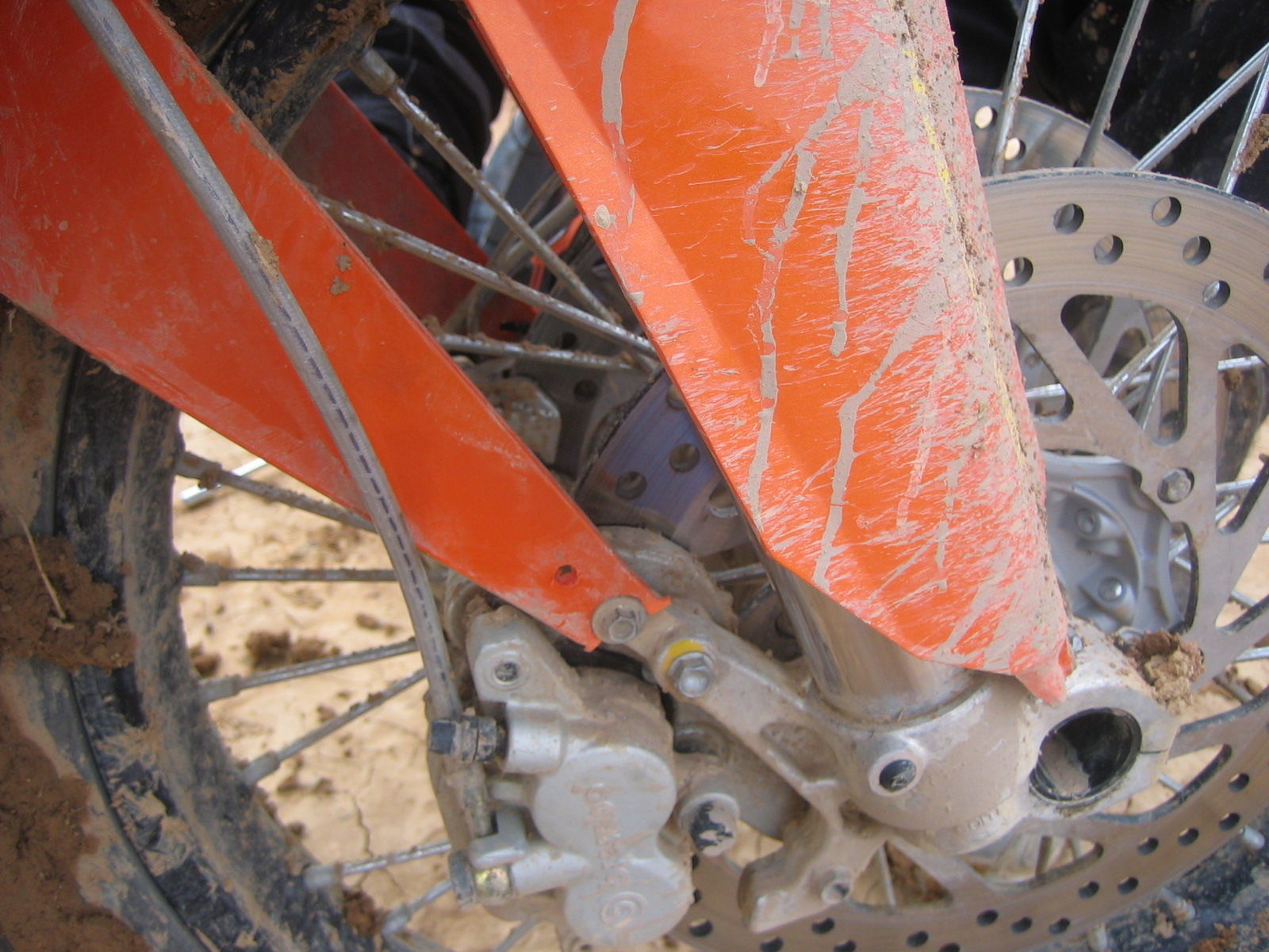 Erst als ich die ADV wegschieben wollte, was nicht ging, bemerkte ich den Abriss des Kotflügels. Dieser lag auf dem verlehmten Rad, als wäre alles normal.